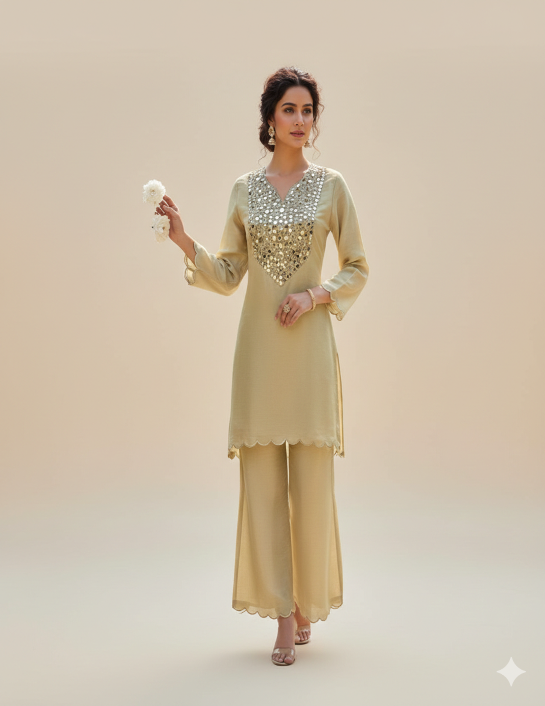 Description: An elegant soft-gold kurti set crafted in delicate soft tissue fabric, featuring intricate mirror embellishment on the neckline for a refined festive glow. Paired with flowy matching pants, this ensemble is perfect for intimate celebrations, festive gatherings, and elegant day events.