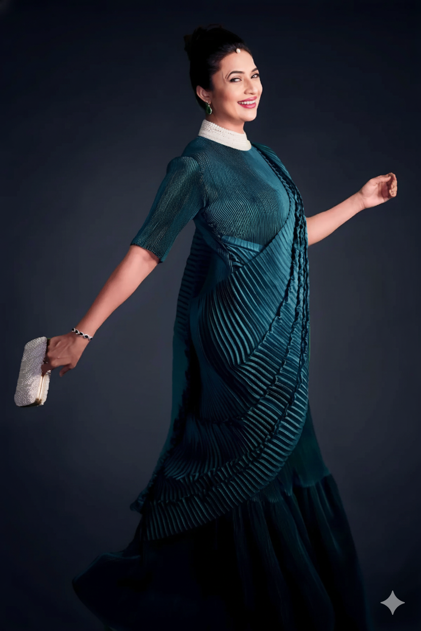 Description: Featuring a Teal Green satin small pleated saree with a big pleated pallu, adorned with pearl handwork on the collar and paired with a matching belt for a graceful finish
