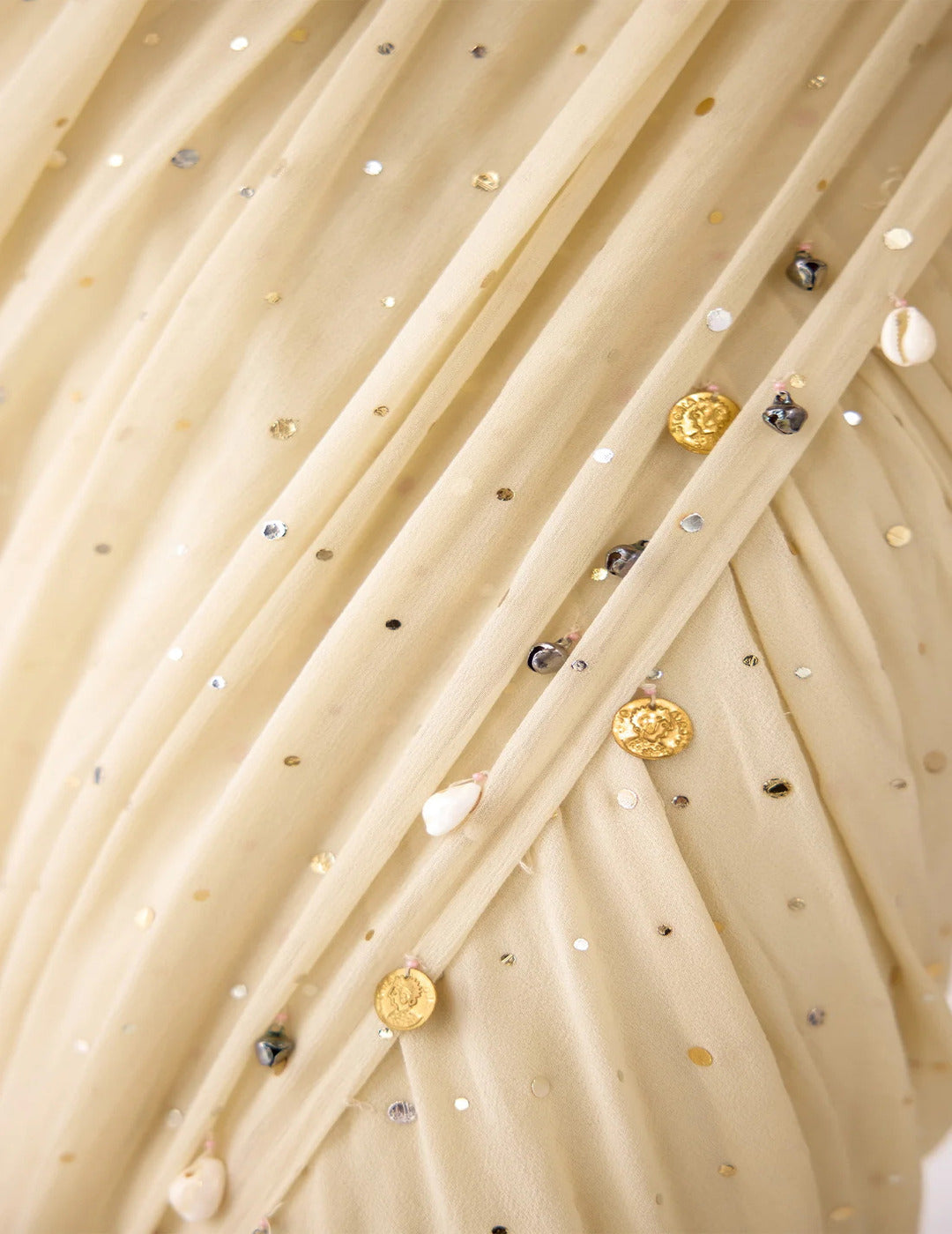 Styling Tips: Pair with delicate silver or pearl jewelry, a soft glam makeup look, and embellished heels for a timeless appearance. A sleek bun or open curls will complement the elegant drape perfectly.