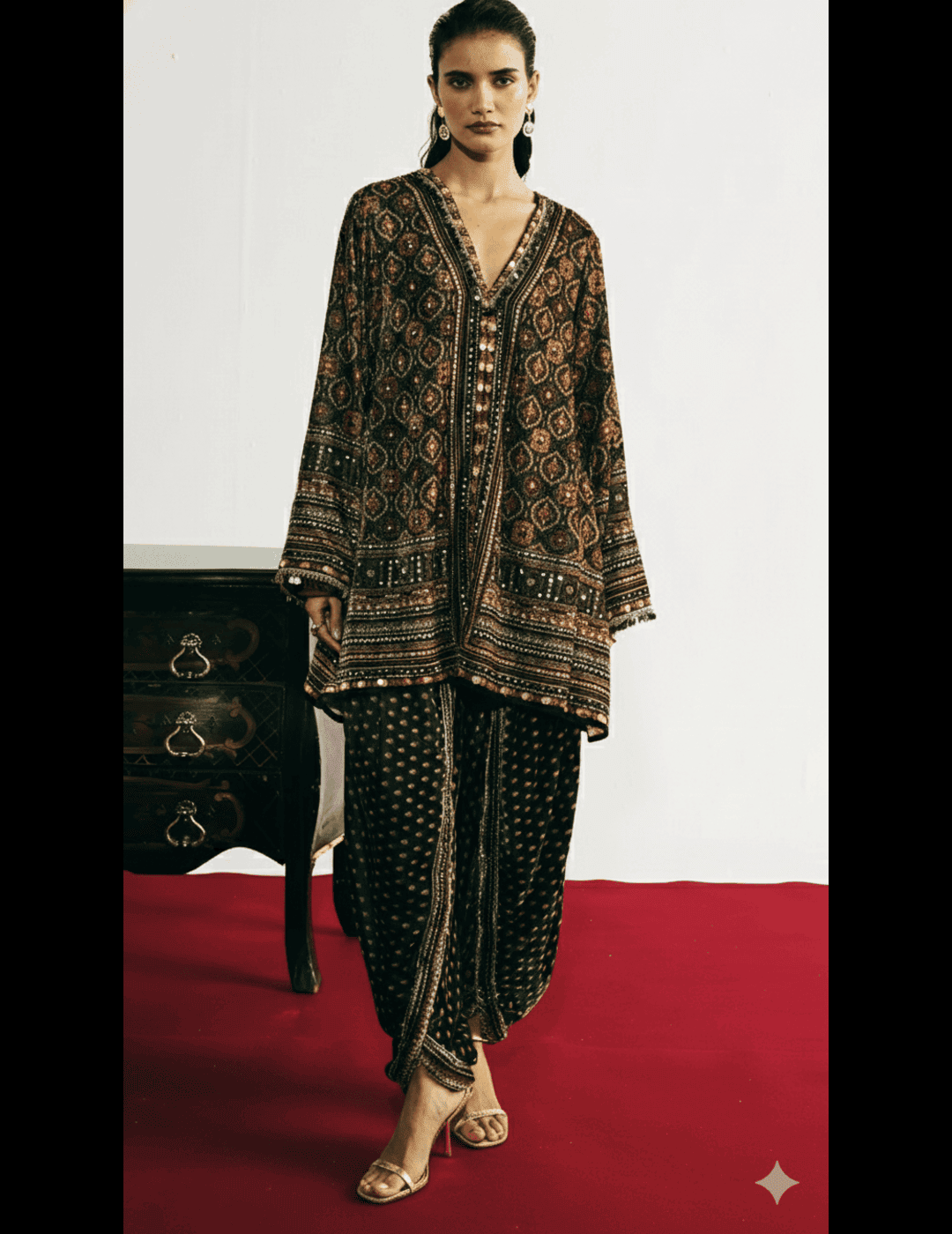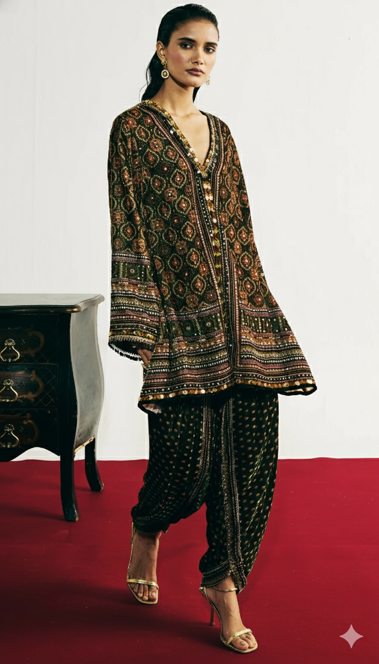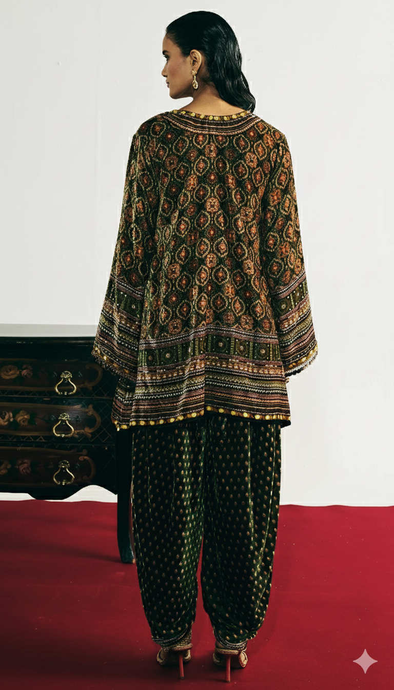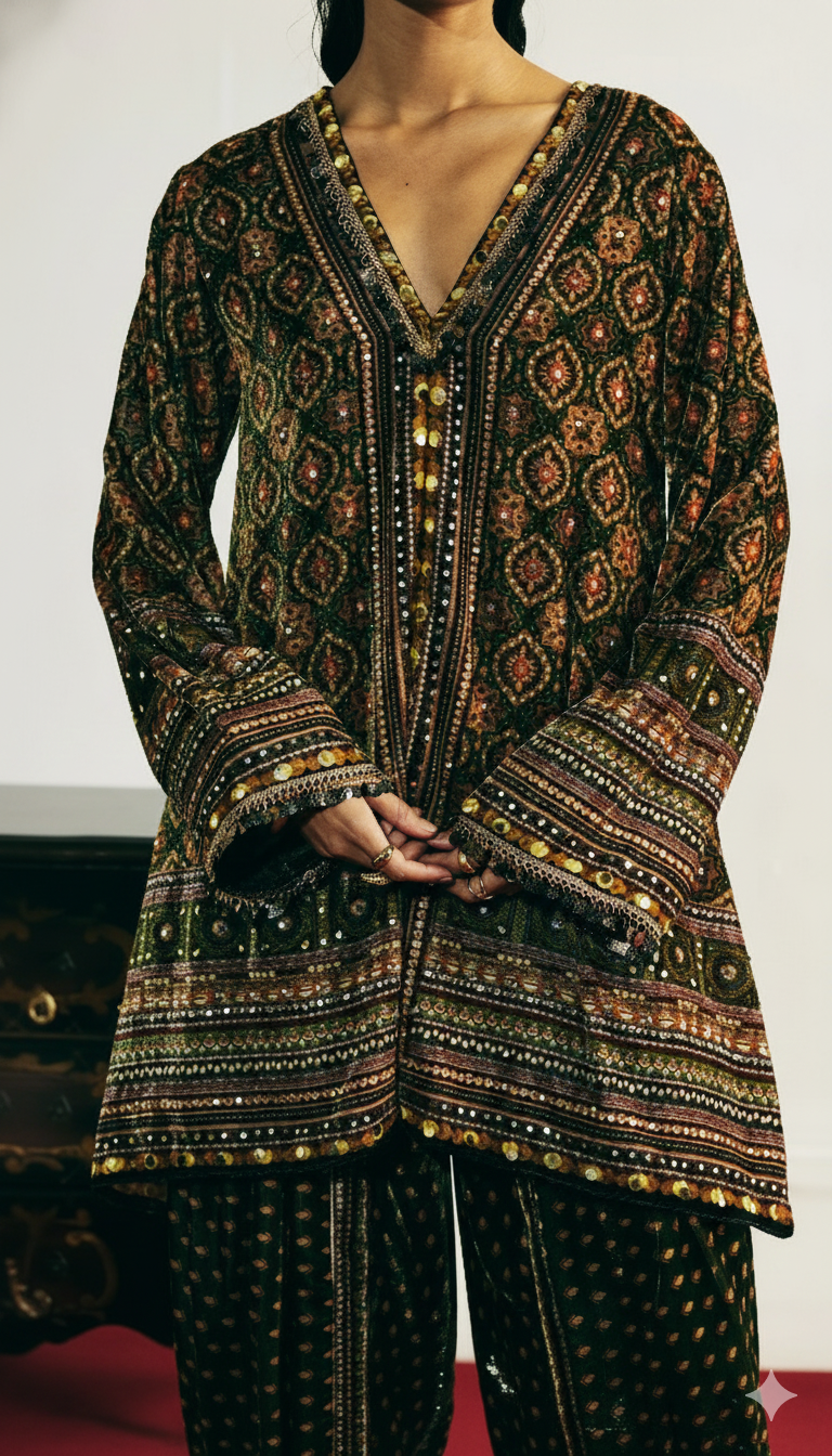 Description: A green velvet kaftan tunic paired with dhoti, featuring rich sequin, mirror, coin, and lace embroidery for a luxurious, festive statement look.