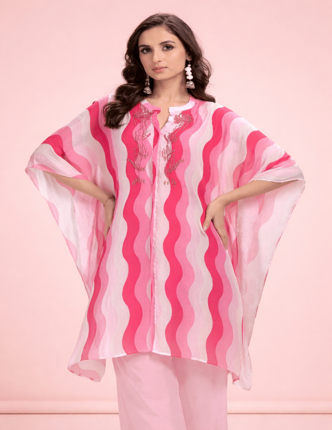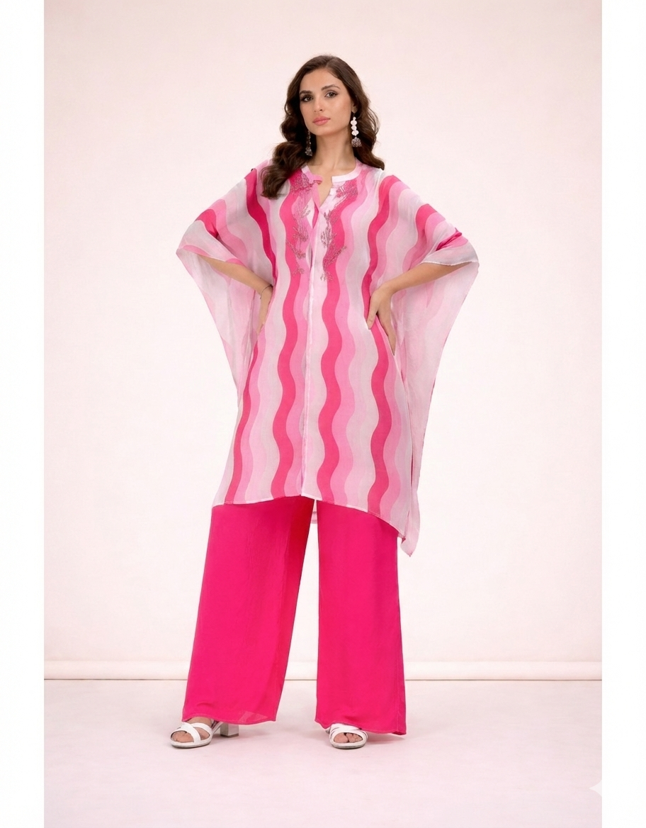 Description: Step into effortless elegance with this pink kaftan kurta palazzo set, featuring delicate floral prints and refined border detailing. Designed with a flowy silhouette and soft fabric drape, it offers comfort and sophistication—perfect for festive occasions, resort wear, and elegant day outings.