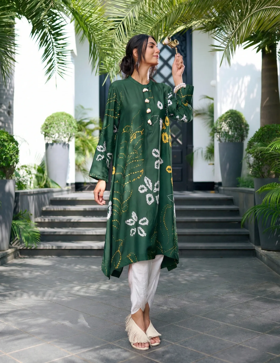 Description: A flowing printed tunic that blends comfort with understated elegance. Designed with a graceful silhouette, shirt collar and front-V detail, it creates a breezy yet sophisticated look — perfect from casual outings to semi-formal gatherings.
