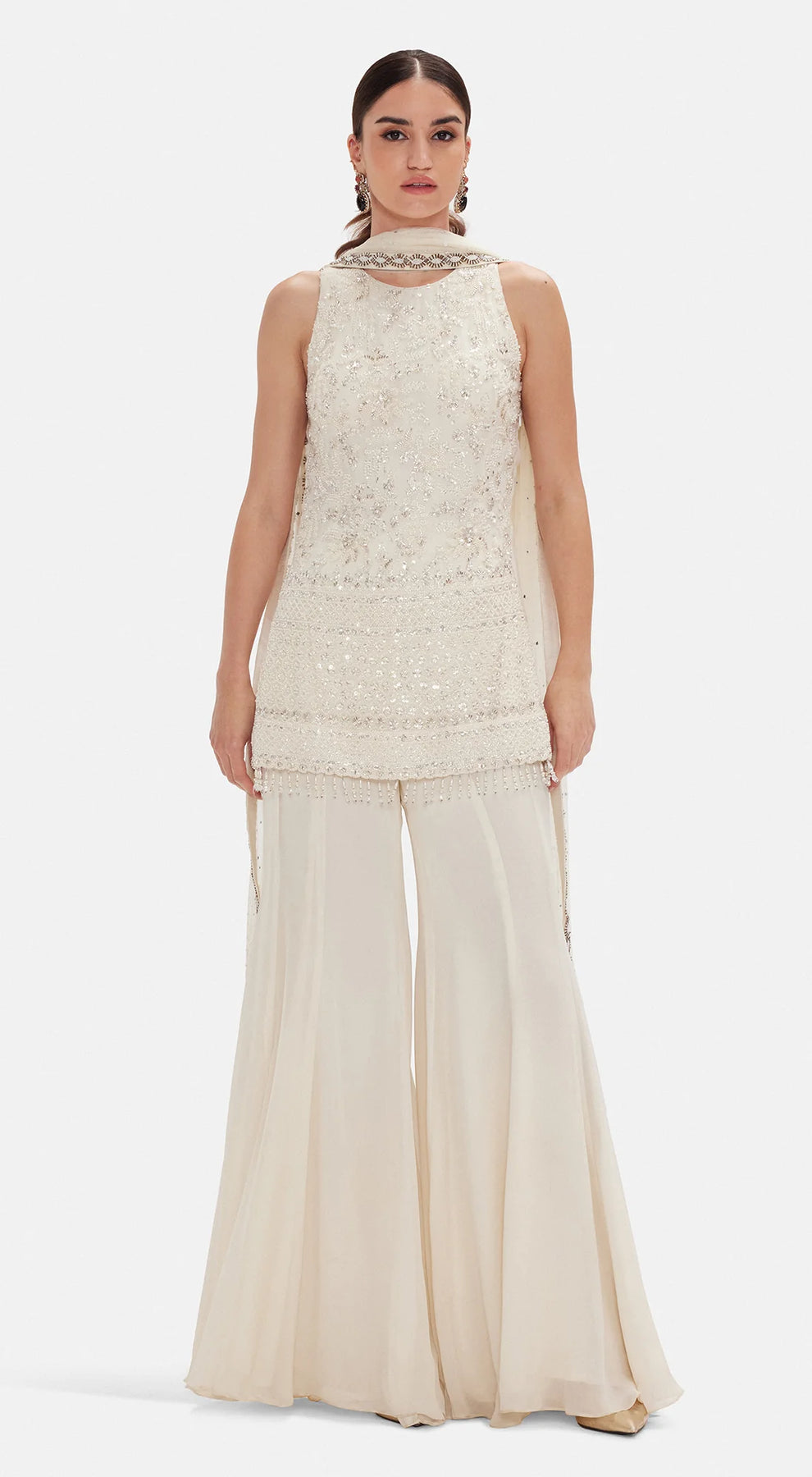 Description: An elegant ivory sharara set crafted in soft flowing georgette, adorned with delicate sequins, cutdana, and bead embellishments for a refined shimmer. The sleeveless round-neck kurta paired with a voluminous sharara and dupatta creates a graceful, timeless silhouette — perfect for festive celebrations and evening occasions.