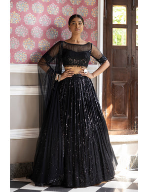 Description: Effortlessly dance the night away in our golden satin lycra pre-draped saree with hand-embroidered waist belt and sequin-embellished net blouse. Ideal for modern divas.