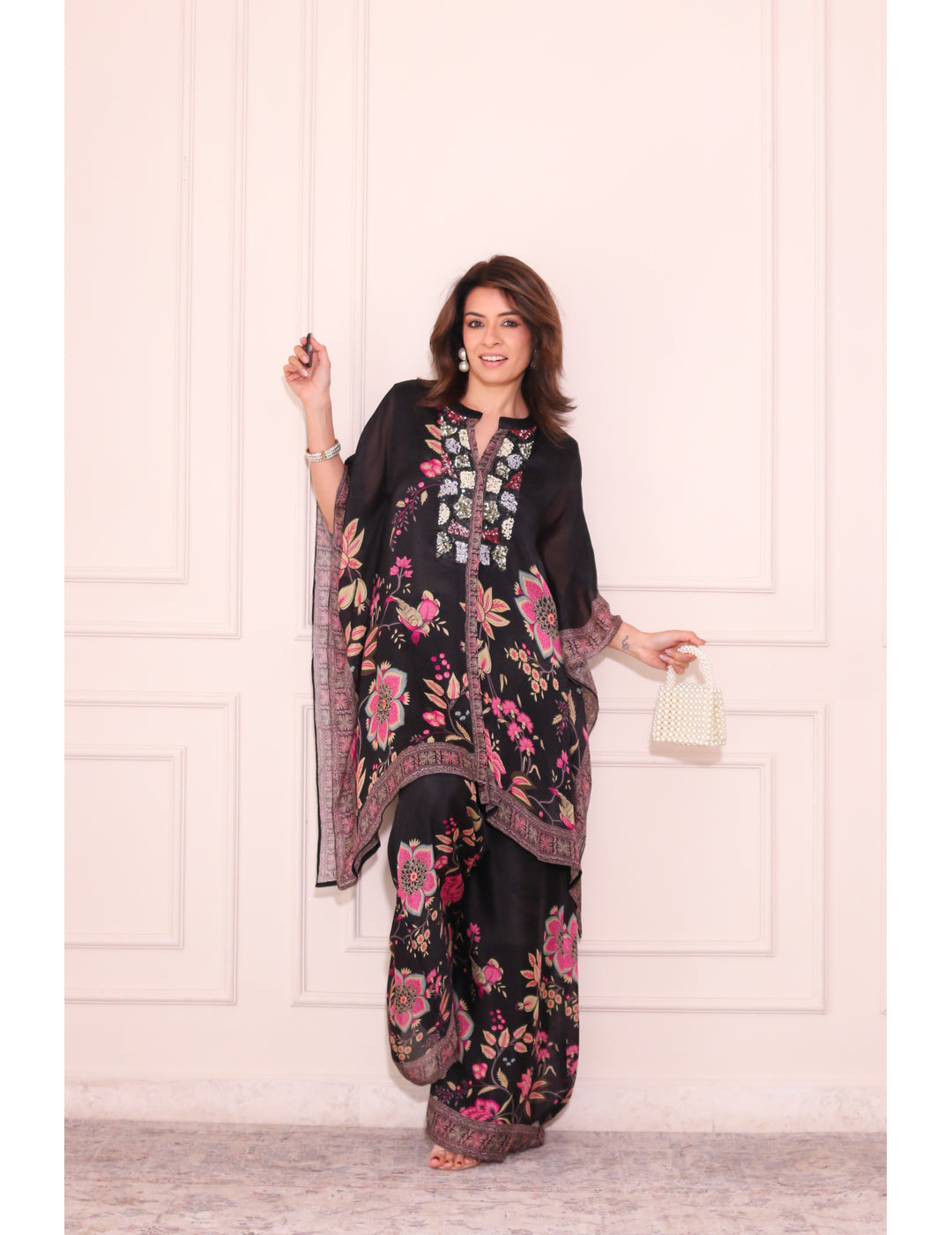 Description: Elevate your ethnic wardrobe with this elegant black floral kaftan palazzo set, adorned with delicate floral prints and intricate border detailing. Paired with a matching dupatta, it offers a graceful drape and effortless comfort—ideal for festive gatherings and refined everyday wear.