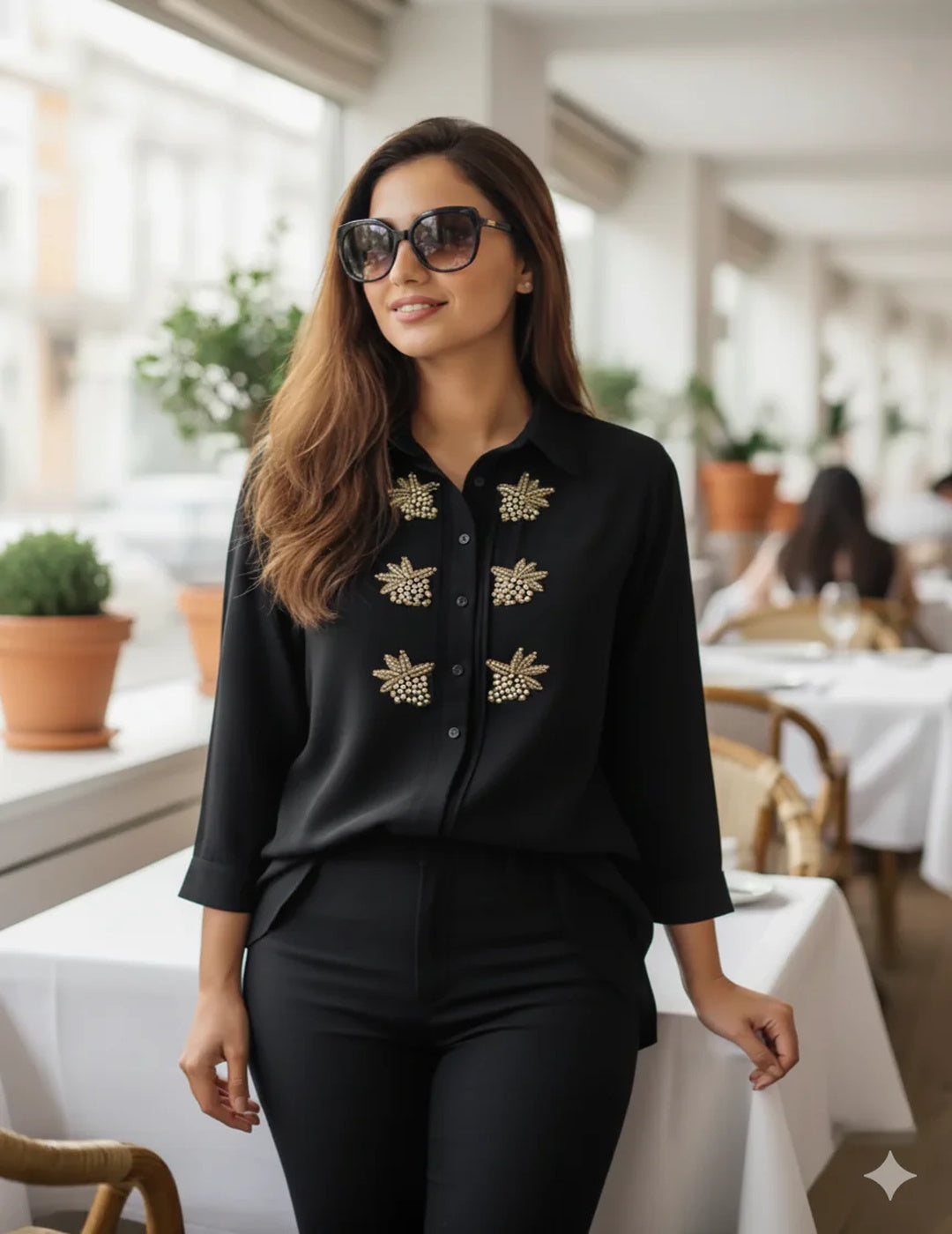 Description: A chic georgette shirt featuring elegant handcrafted embroidery, offering a perfect blend of sophistication and ease for stylish party looks or elevated casual outings.