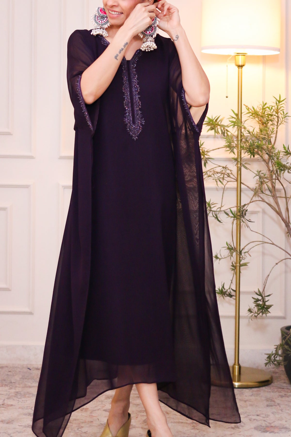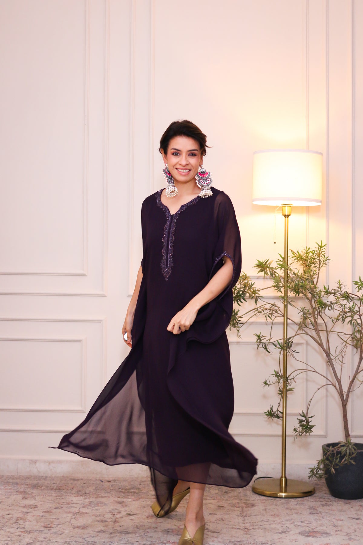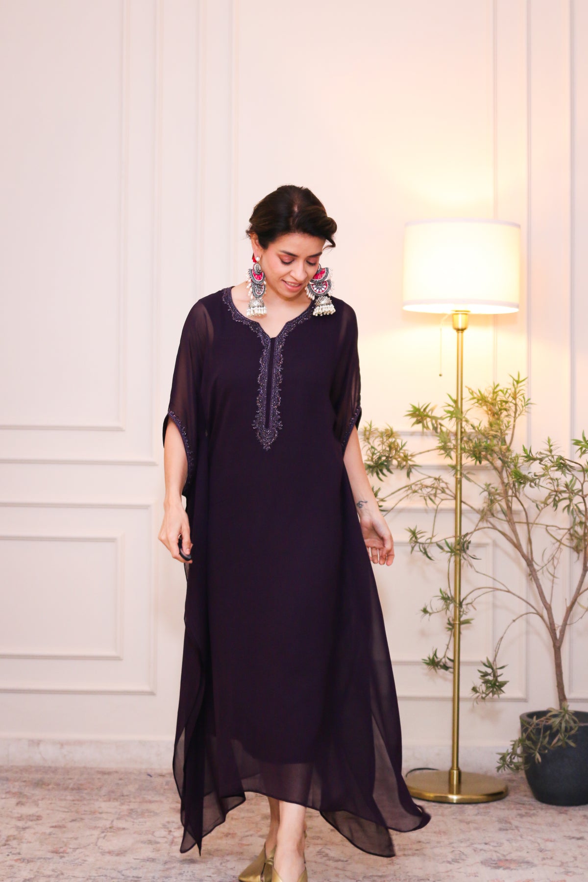 Description: Elegant black kaftan crafted from viscose georgette fabric with hand embroidered neckline, featuring a flowy silhouette, breathable comfort, perfect for festive evenings and elegant occasions.
