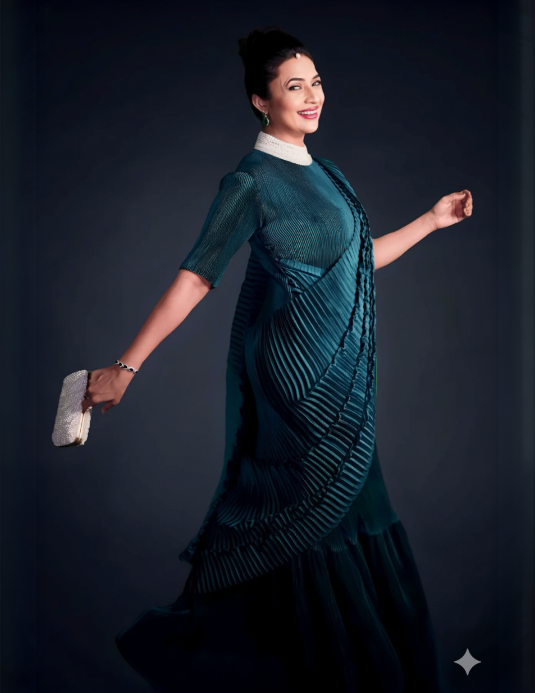 Description: Featuring a Teal Green satin small pleated saree with a big pleated pallu, adorned with pearl handwork on the collar and paired with a matching belt for a graceful finish