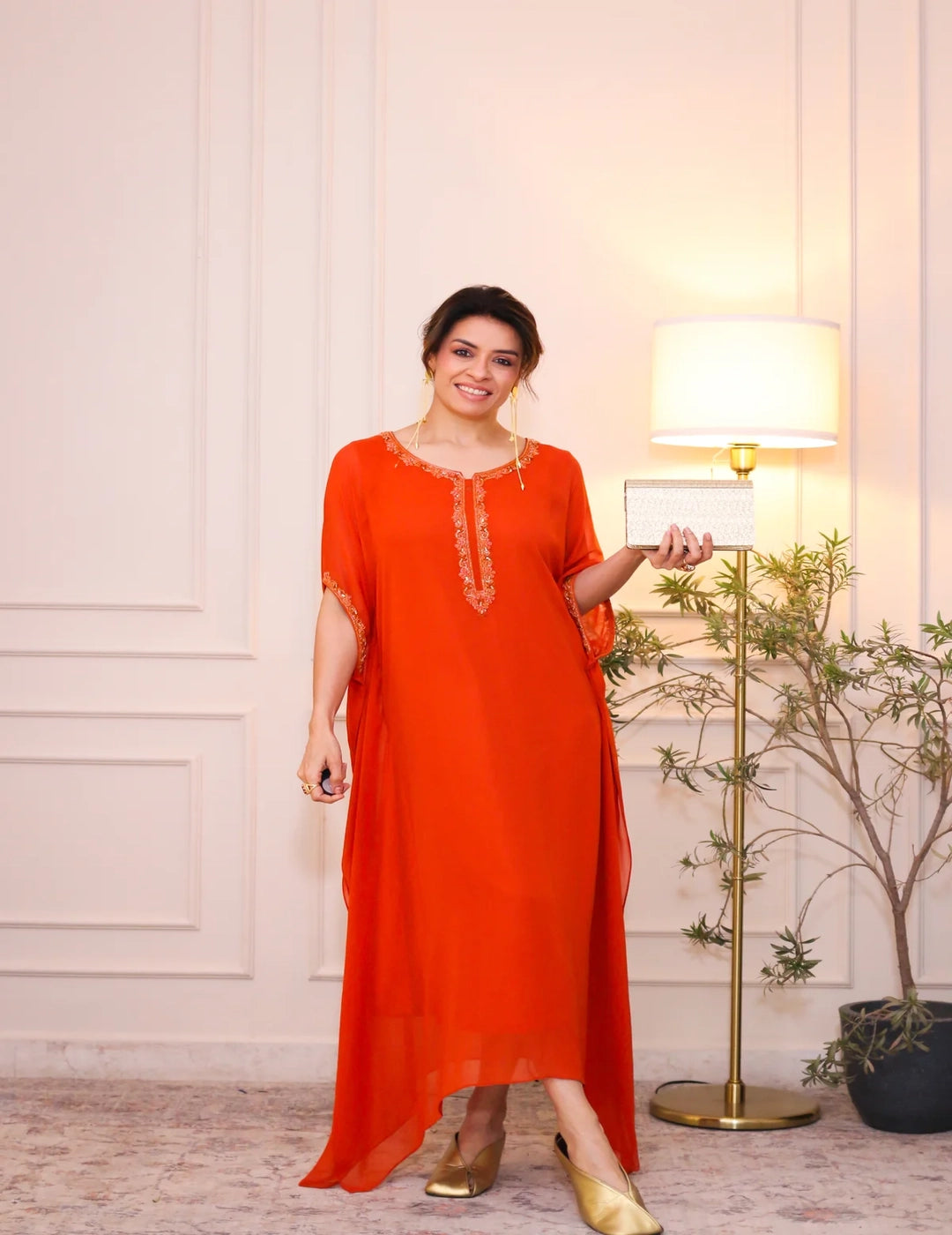 Description: Elegant tangerine kaftan crafted from viscose georgette fabric with hand embroidered neckline, featuring a flowy silhouette, breathable comfort, perfect for festive evenings and elegant occasions.