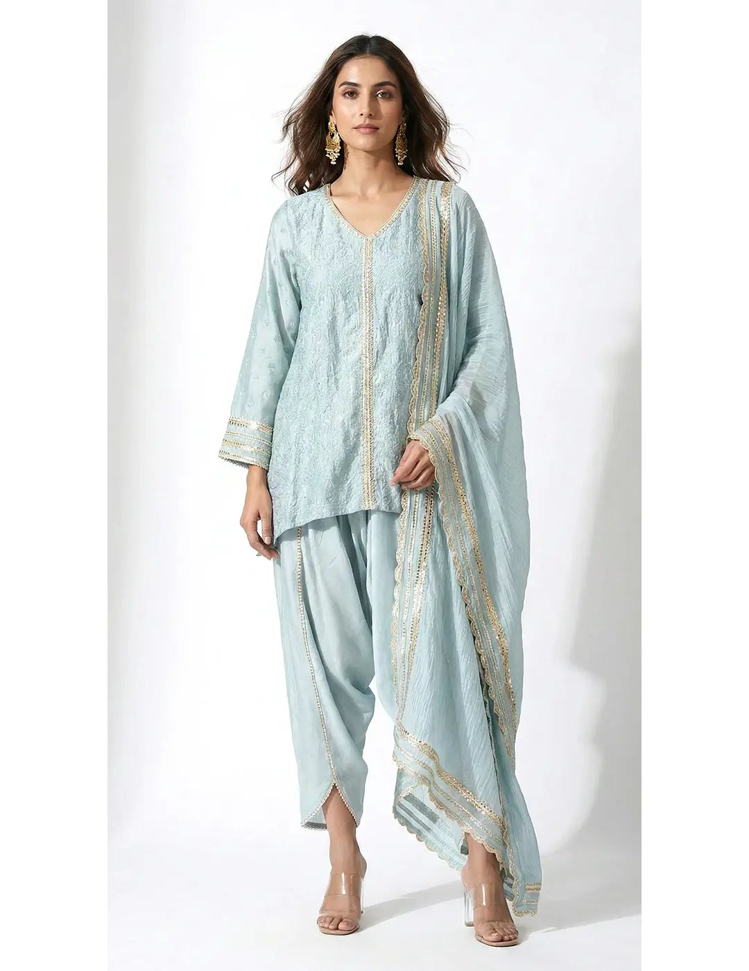 Description: A refined blue kurta set crafted in a breathable cotton-linen blend, adorned with delicate gota work and bead embellishments. The elegant V-neck kurta paired with stylish tulip pants and a graceful dupatta creates a sophisticated ensemble perfect for festive gatherings and daytime celebrations.