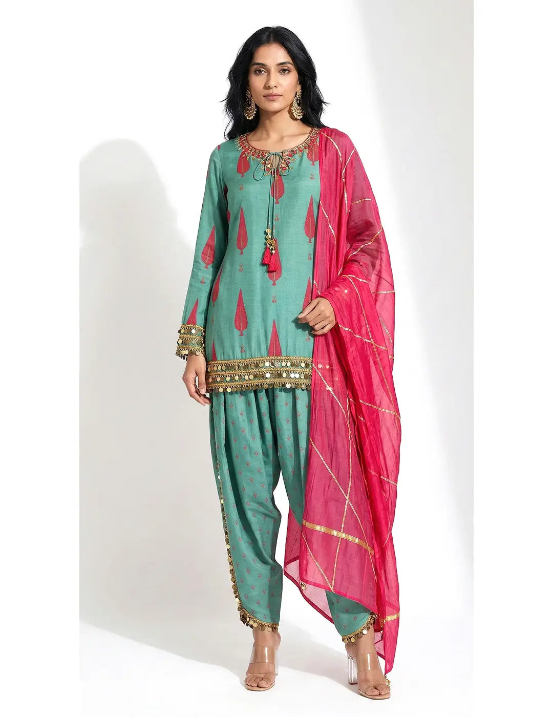 Description: A graceful green kurta set crafted in soft printed muslin, adorned with delicate thread and coin embroidery for a subtle festive shimmer. The elegant round-neck kurta paired with stylish tulip pants and a flowing dupatta creates a light, comfortable ensemble perfect for celebrations and daytime occasions.