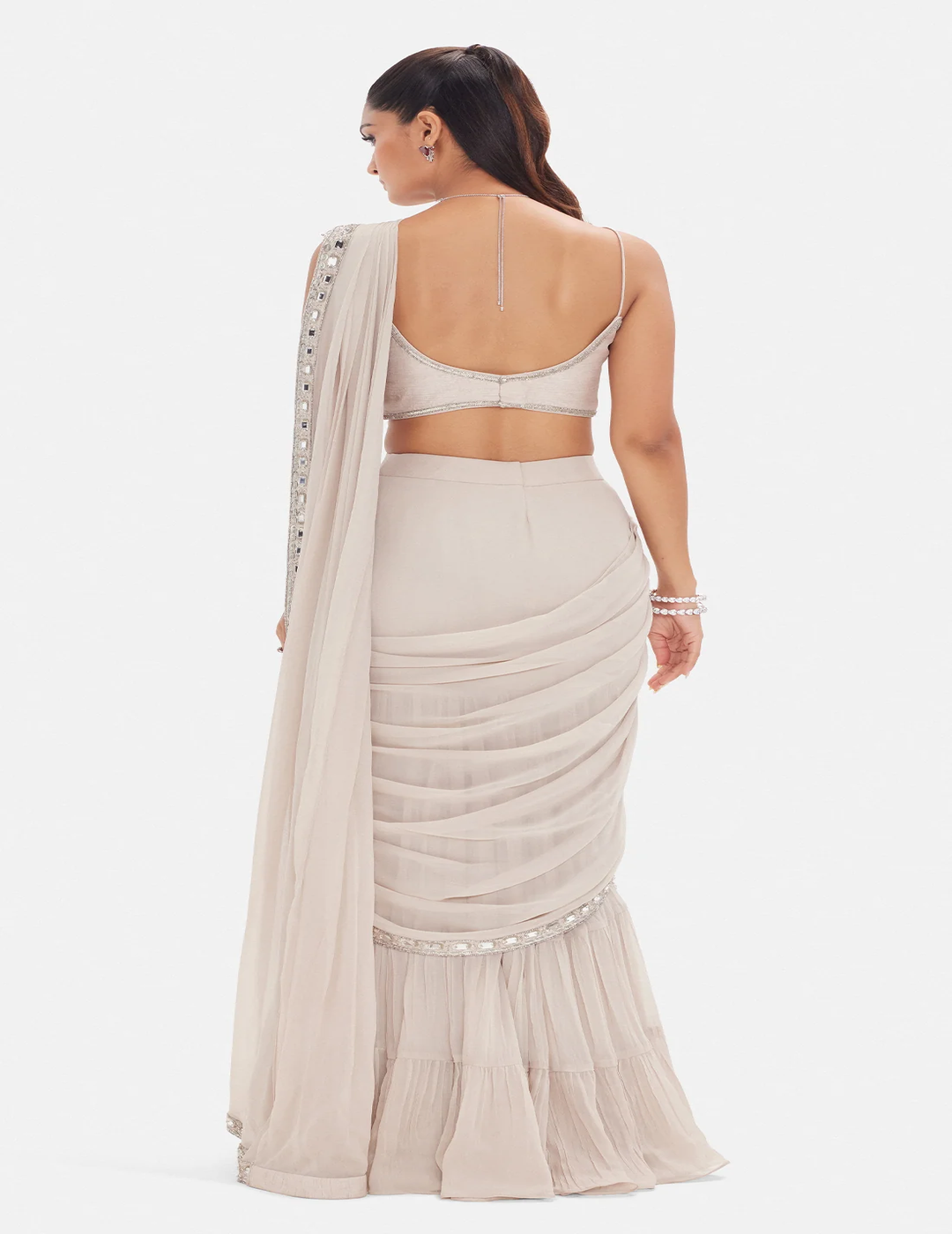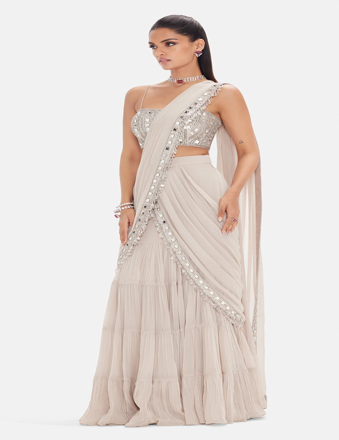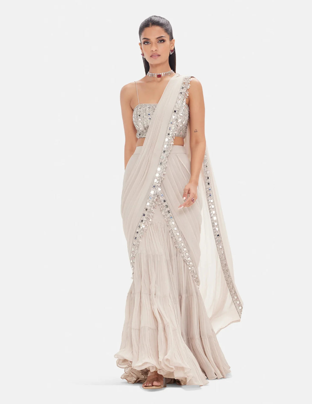 Description: A contemporary saree set crafted in fluid georgette, featuring intricate embellishments of sequins, coins, mirror work, pearls and beads. Designed with a chic bandeau blouse, draped skirt and an elegant cape, this ensemble blends modern glamour with timeless sophistication, perfect for statement occasions.