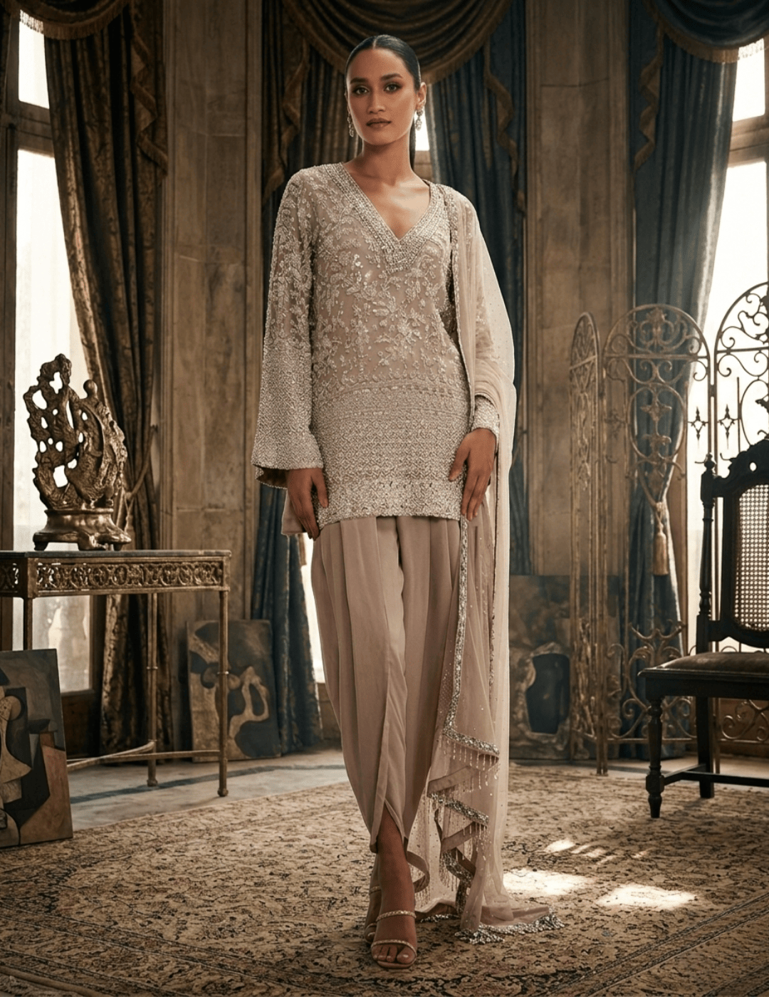 Description: An elegant beige dhoti set crafted in flowing georgette, beautifully adorned with sequins, cutdana, and bead embroidery. Featuring a flattering V-neck kurta with full sleeves, this sophisticated ensemble blends modern style with traditional charm—perfect for festive celebrations and special occasions.