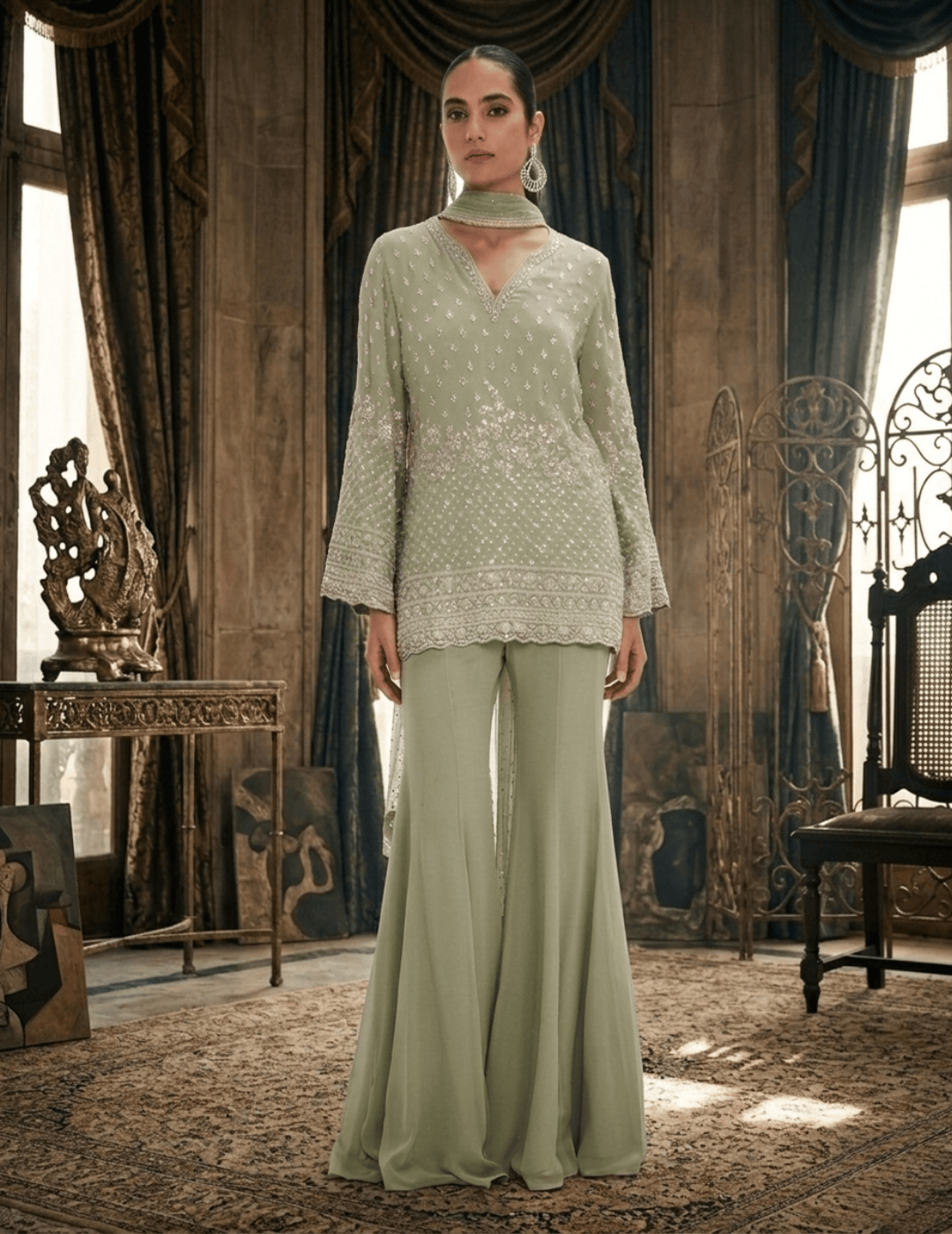 Description: A graceful pista green sharara set crafted in soft georgette, beautifully detailed with sequins, cutdana, and bead embroidery. The elegant V-neck kurta with full sleeves paired with a flowing sharara and dupatta creates a refined festive look, perfect for celebrations and special occasions.