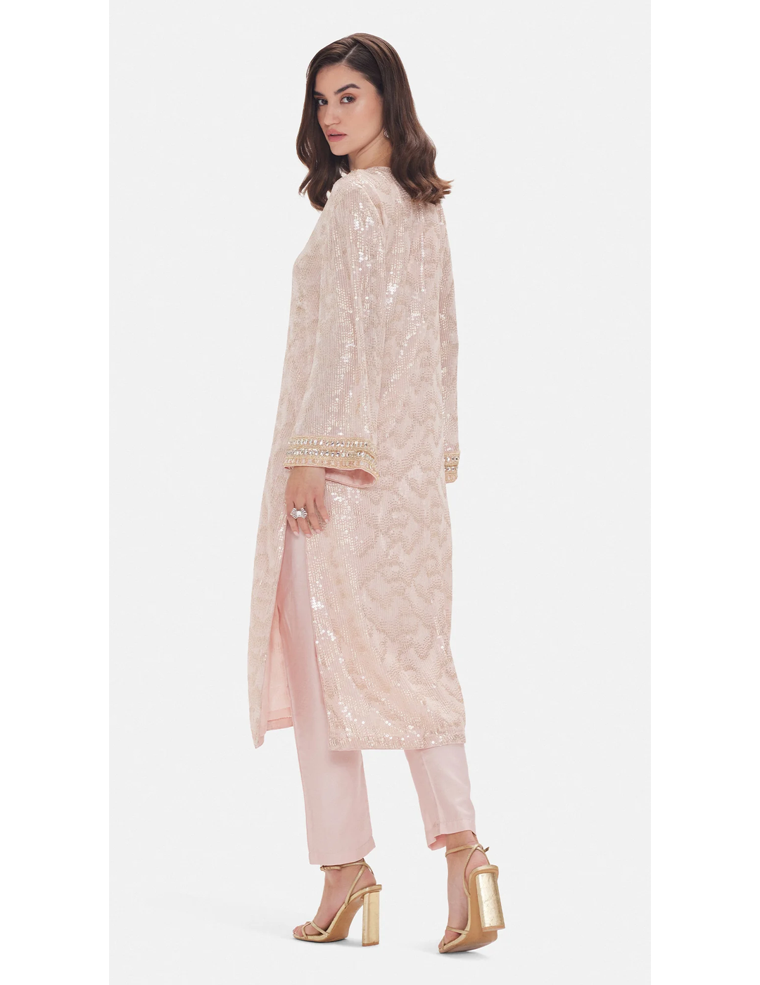 Description: A graceful ensemble crafted in soft pink georgette, adorned with delicate bead, sequin and stone embellishments. Designed with a flattering V-neck kurta and paired with straight pants and a dupatta, this set exudes understated glamour — perfect for festive and celebratory occasions.