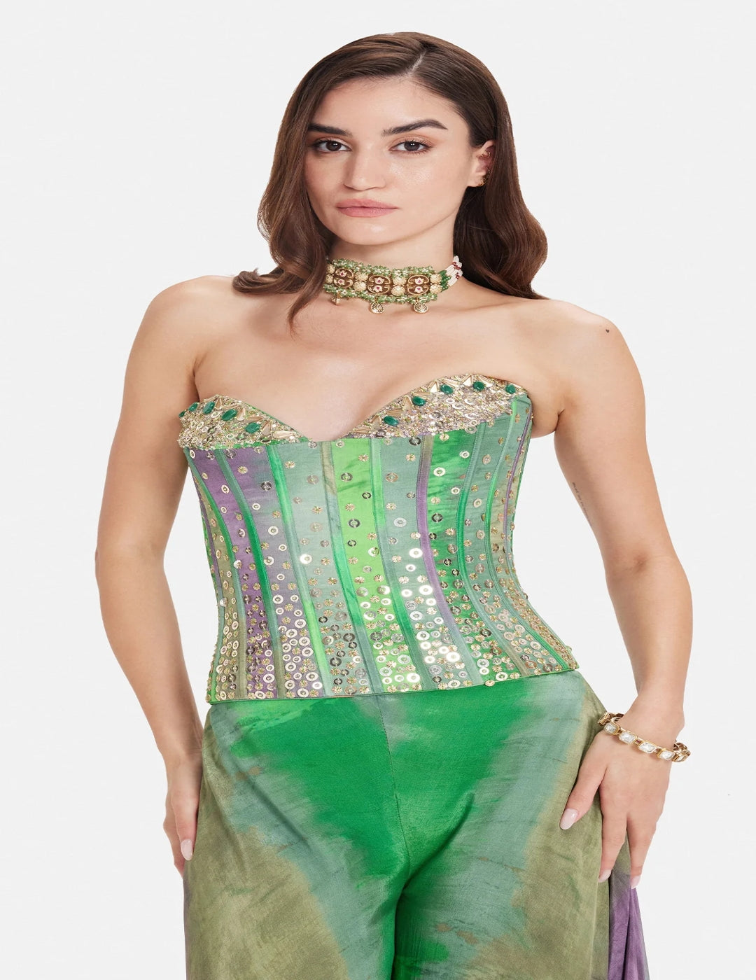 Description: A striking green corset and sharara set crafted in crepe, highlighted with elegant sequins, beads, and zari embroidery. Featuring a sweetheart neckline and a flattering silhouette, this ensemble is perfect for festive evenings and celebratory occasions.