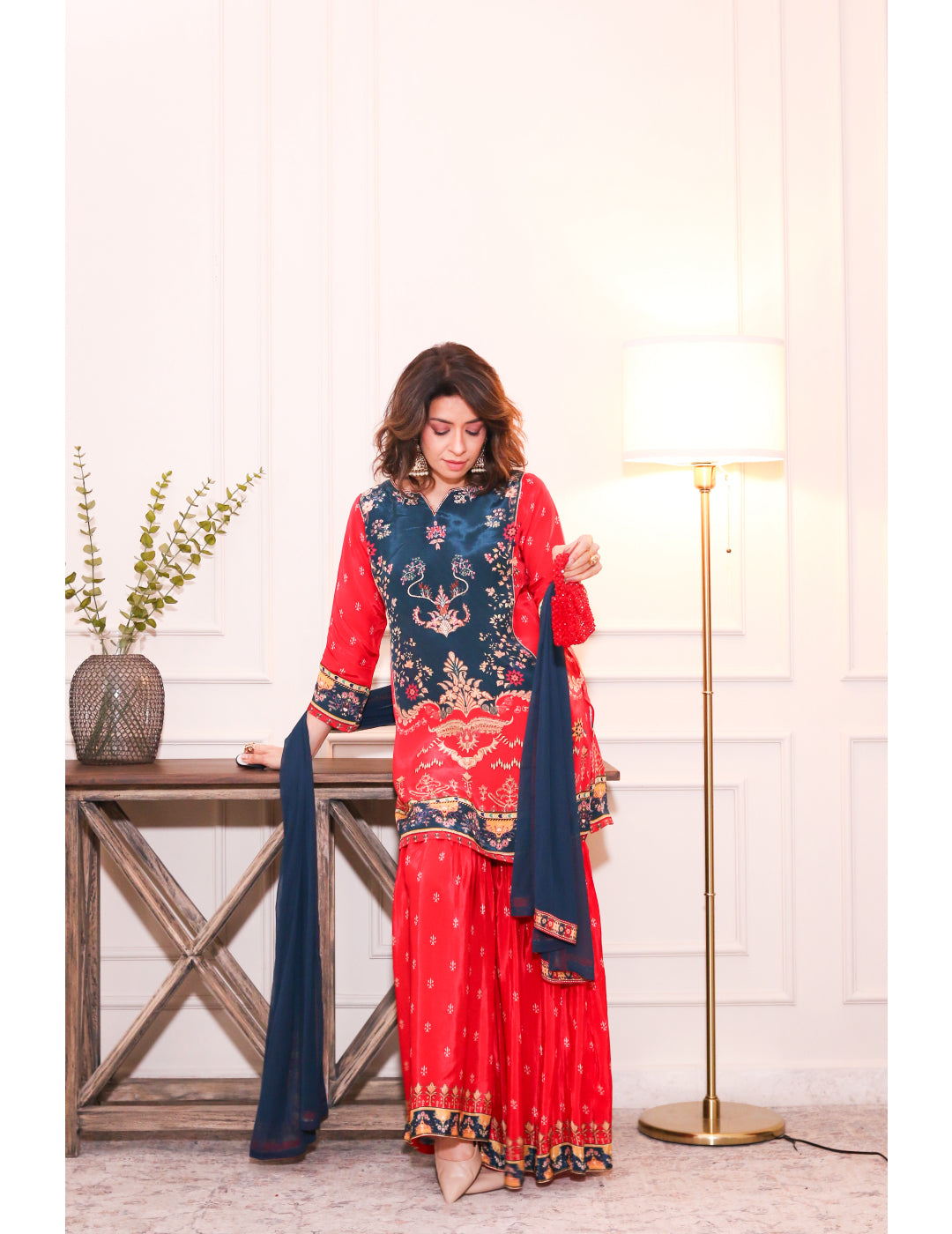 Color: Navy Blue & Crimson Red with Gold Embroidery Accents