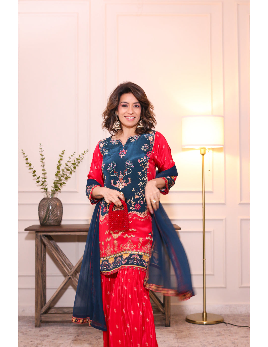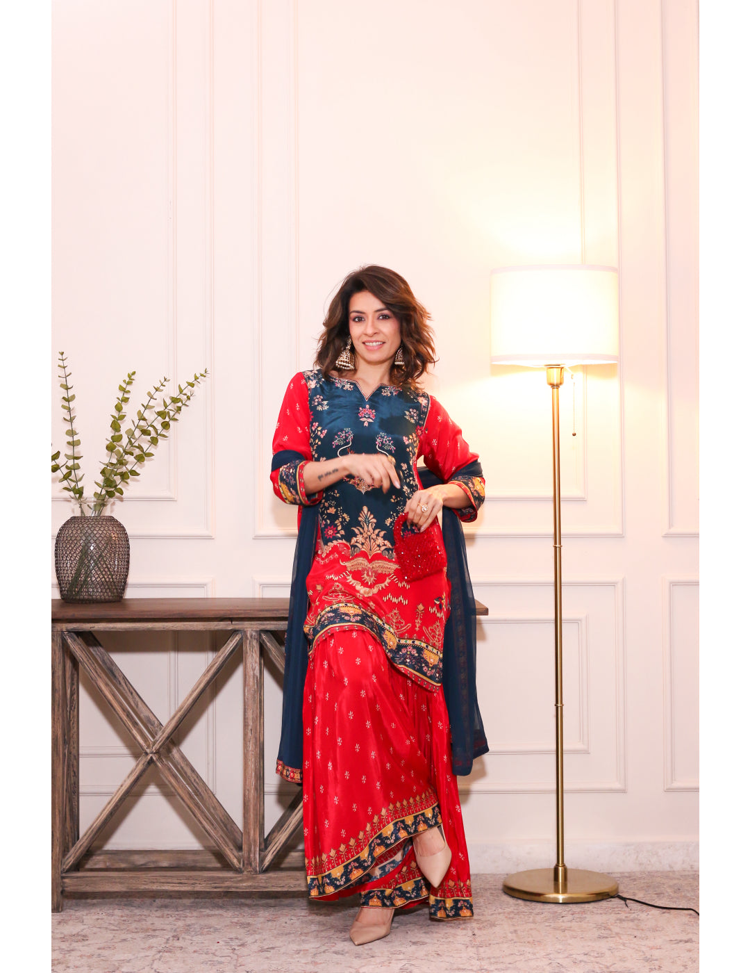 Description: Viscose crepe kurta set with intricate hand embroidery, contrasting sleeves, flared sharara and flowing dupatta, blending elegance and comfort for festive occasions.