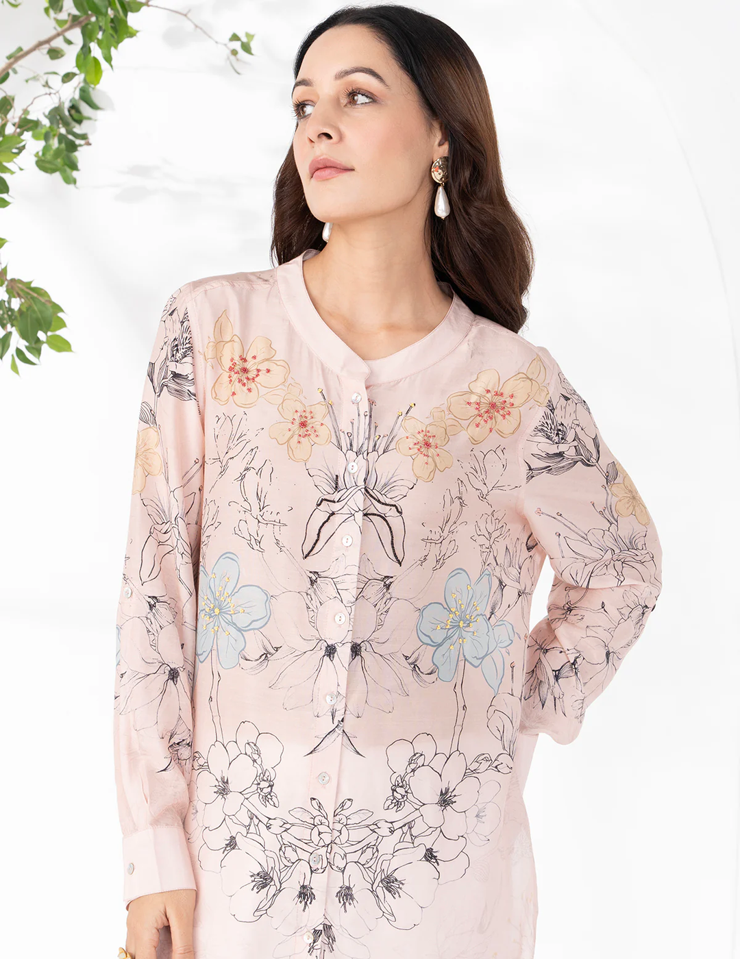 Description: A soft and sophisticated shirt designed with artistic floral prints and delicate embroidered detailing. Rendered in gentle pastel tones, it offers a refined yet effortless look — perfect for workdays, casual outings, and elevated everyday styling.