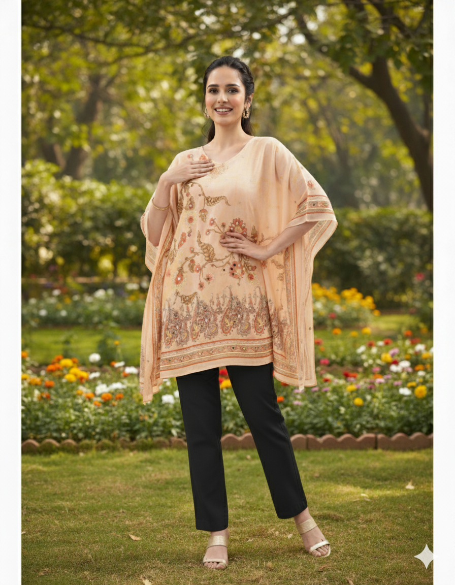 Description: Peach Printed Kaftan: Effortlessly stylish, versatile, and perfect for adding a touch of elegance to any occasion or outing.