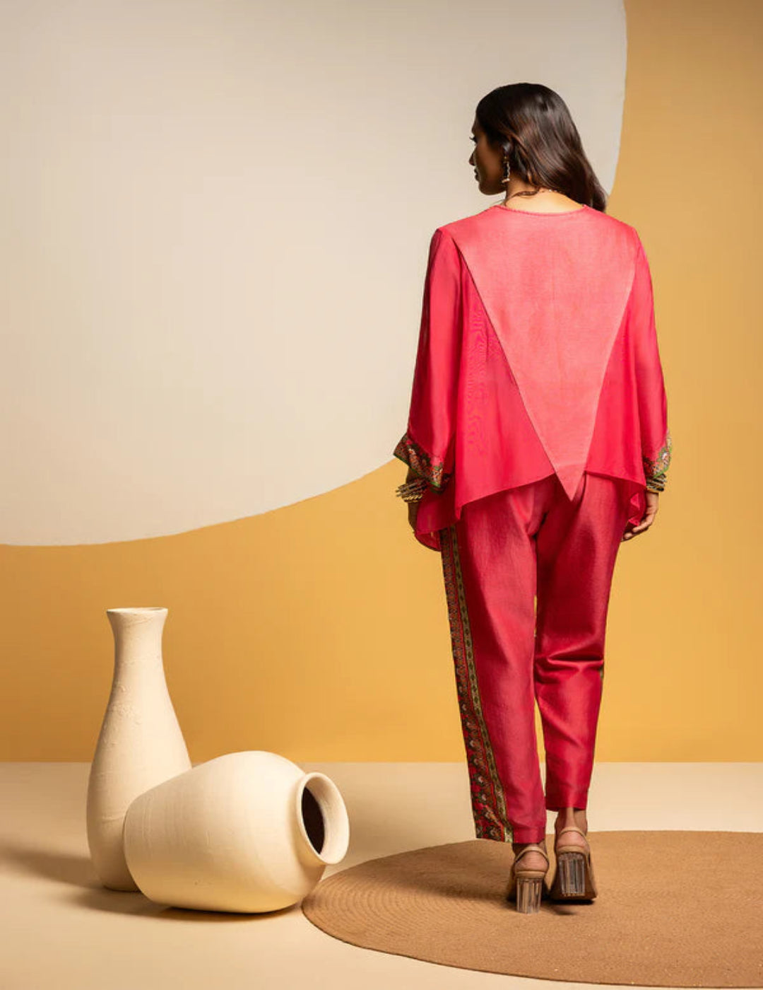 Description: Pink Taarani embellished V-neck asymmetric top, paired with printed pants in chanderi.