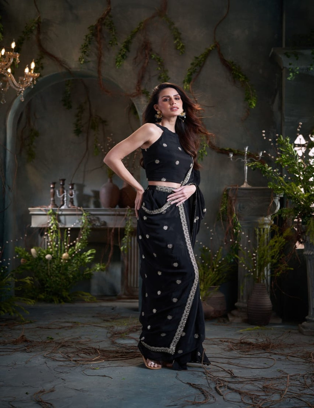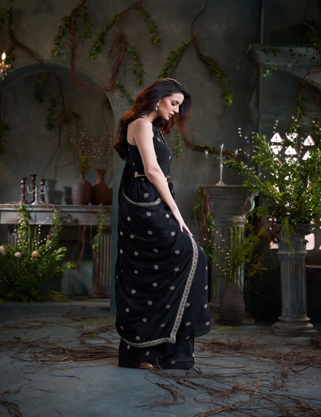 Description: A Chinon pre-draped saree set featuring a fitted incut blouse and ready-to-wear draped skirt, finished with delicate embroidery for effortless elegance.