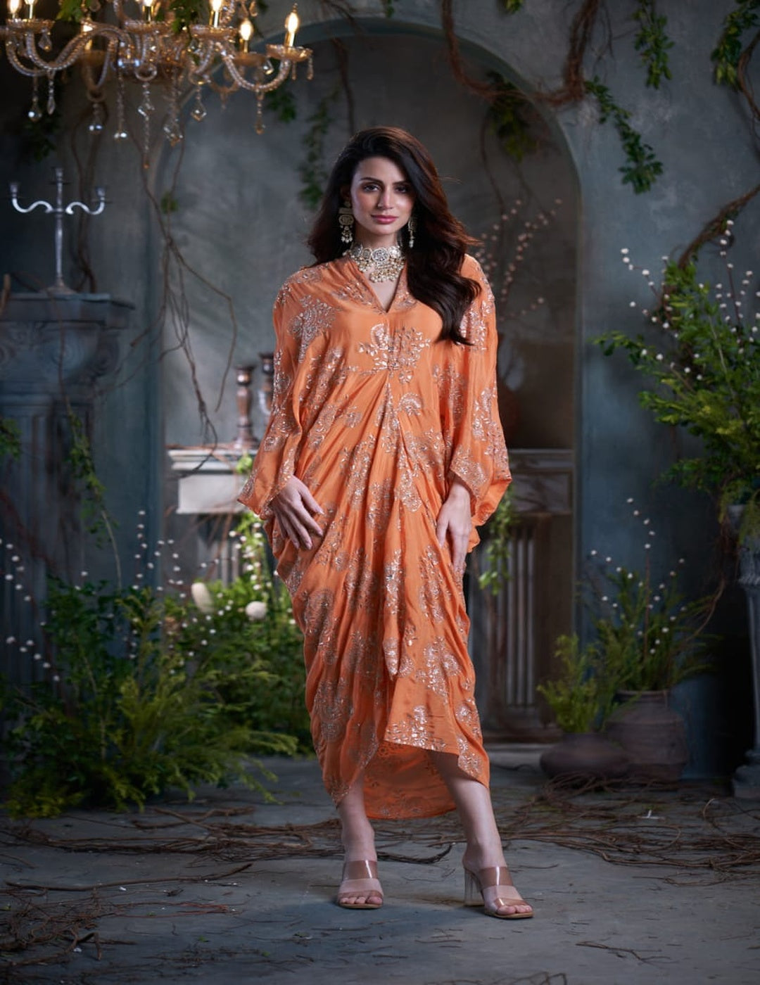 Description: A peach Chinon midi kaftan dress featuring matte gold embroidery, a V-neckline, and a relaxed tapered silhouette, offering an elegant, flowy look for festive occasions.