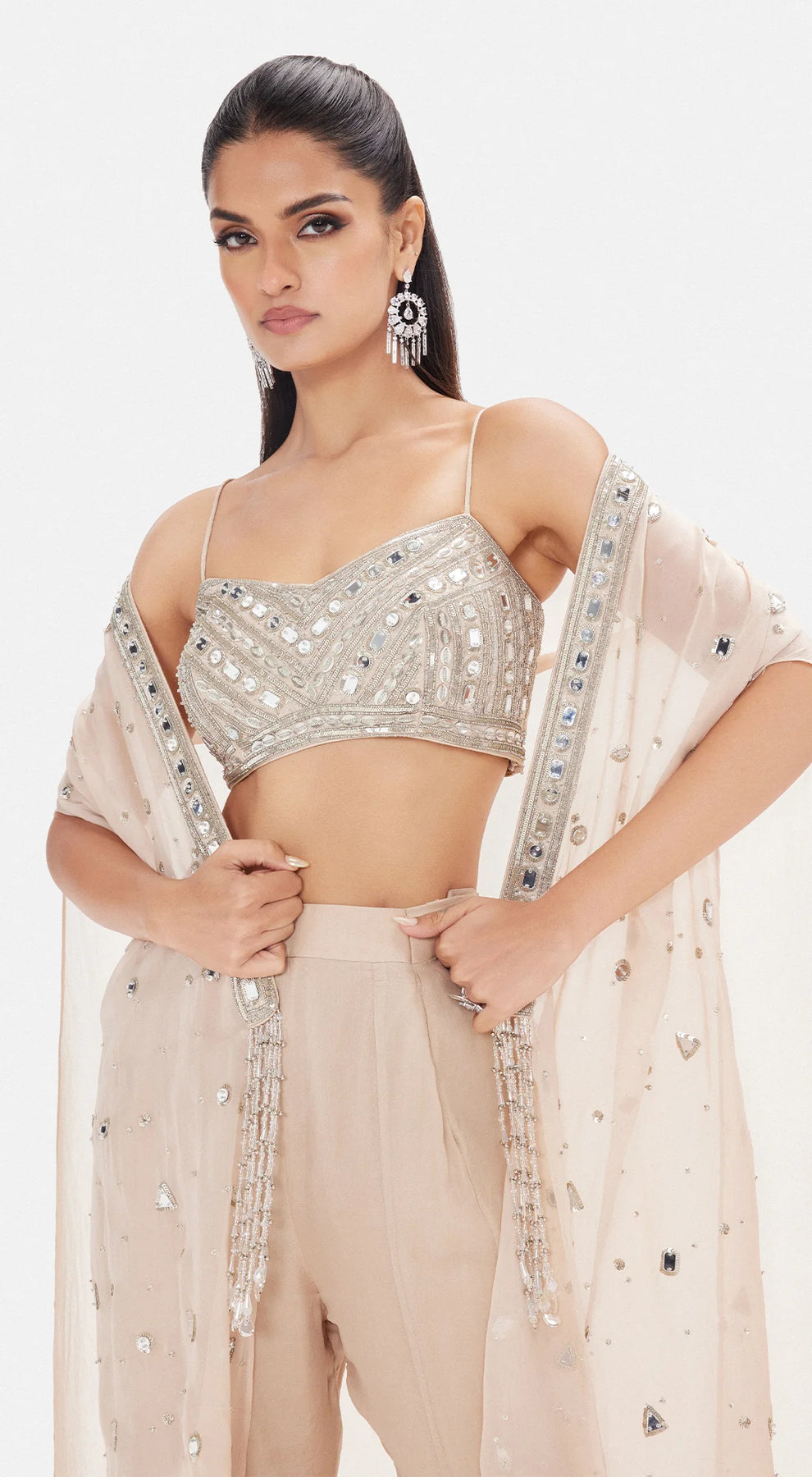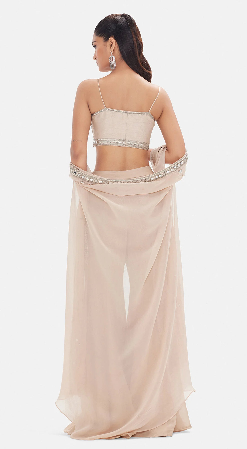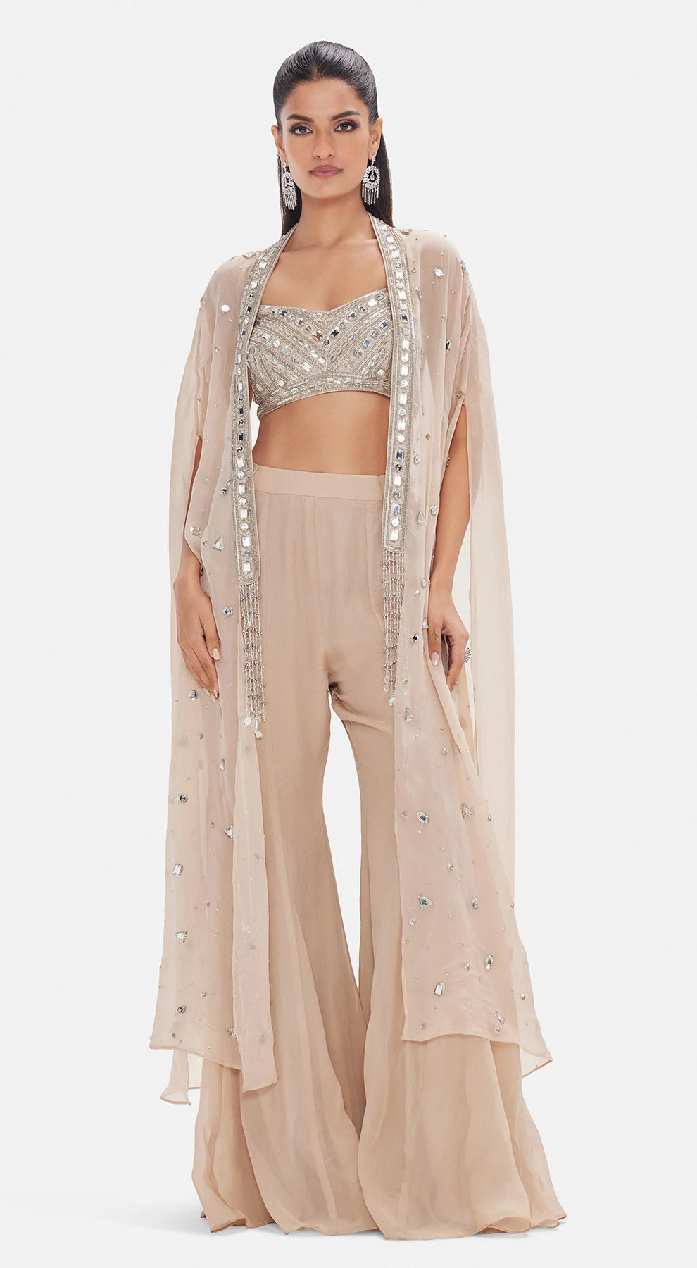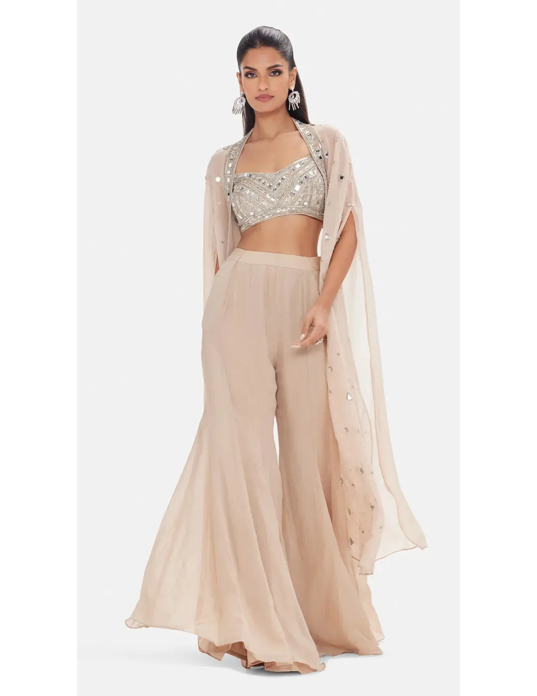 Description: An ethereal beige ensemble crafted in delicate organza, lavishly adorned with sequins, cutdana, pearl, brass, and bead embellishments. Featuring a structured sweetheart blouse, flowing sharara, and a dramatic cape with cape sleeves, this set radiates modern glamour with a regal touch — perfect for grand celebrations.