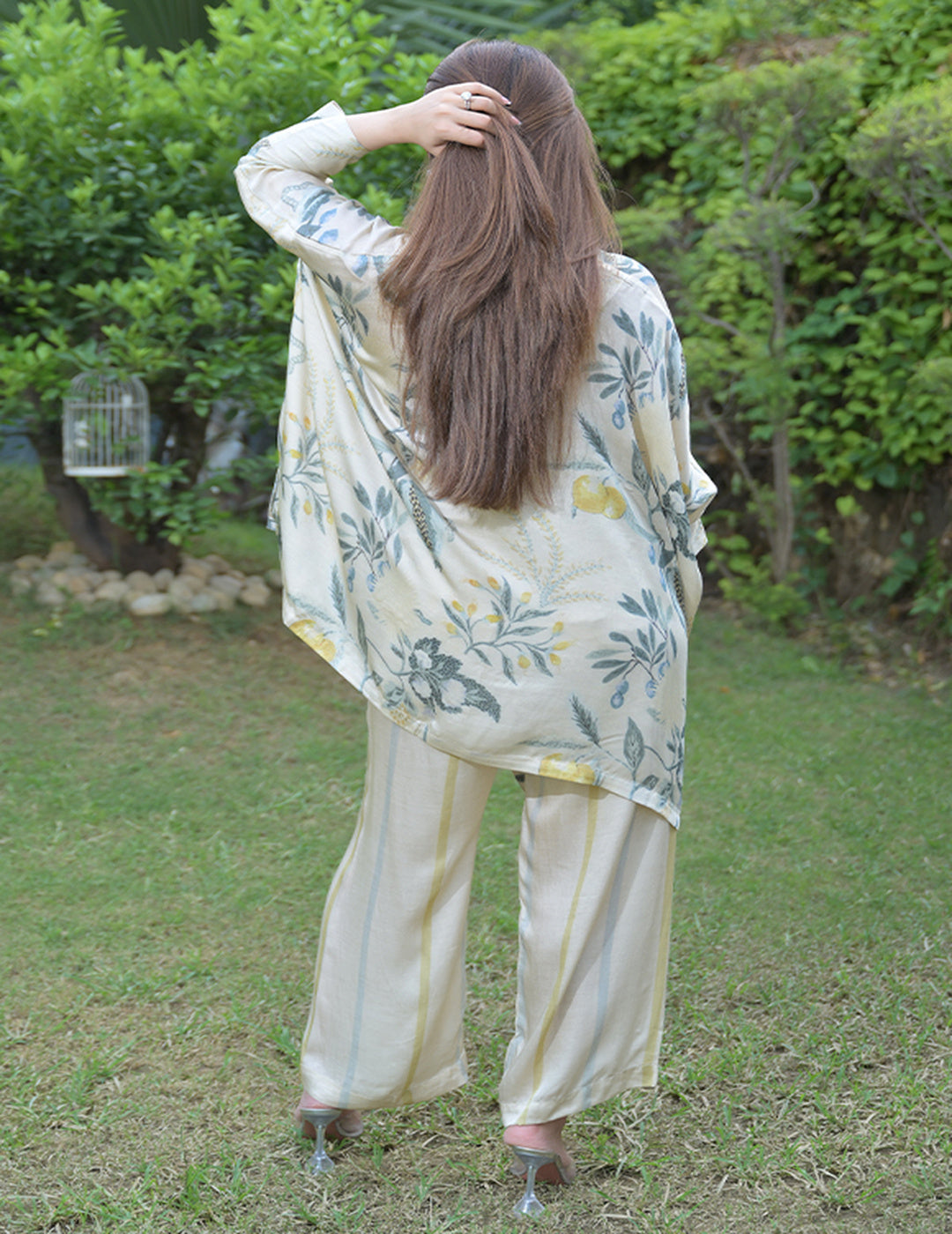 Description: A cream cotton silk co-ord set crafted in soft Moroccan silk with a relaxed fit. Lightweight, breathable, and finished with timeless fusion prints for all-day comfort.