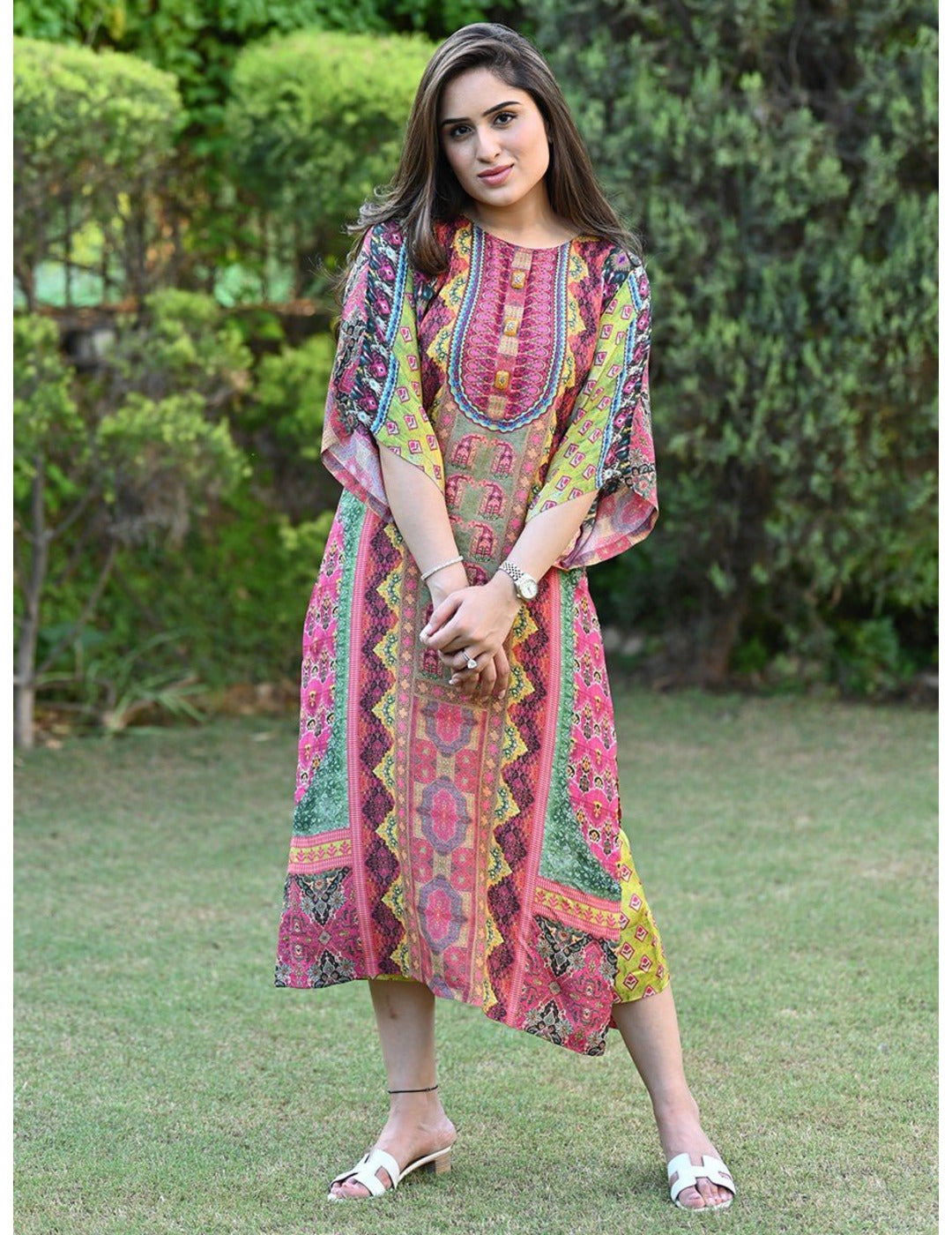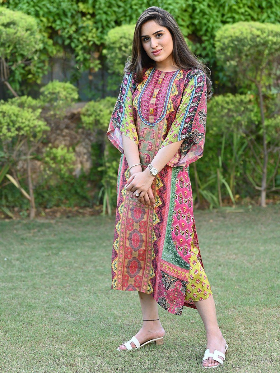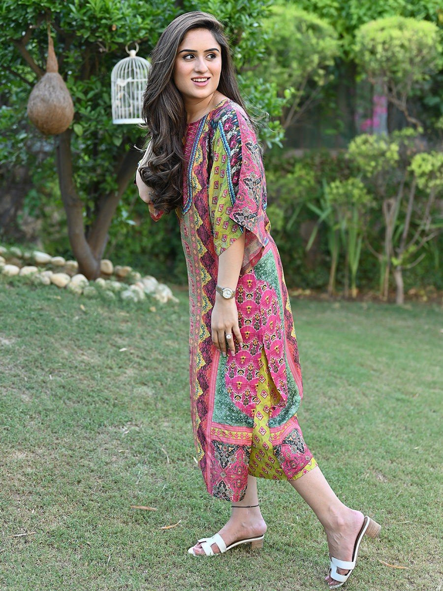 Description: A stylish and effortless kaftan pant set crafted in luxurious satin silk, designed for all-day comfort and elegance. Featuring timeless fusion prints and a relaxed silhouette, this ensemble feels soft on the skin and is perfect for humid weather — ideal for both casual outings and refined occasions from AM to PM.