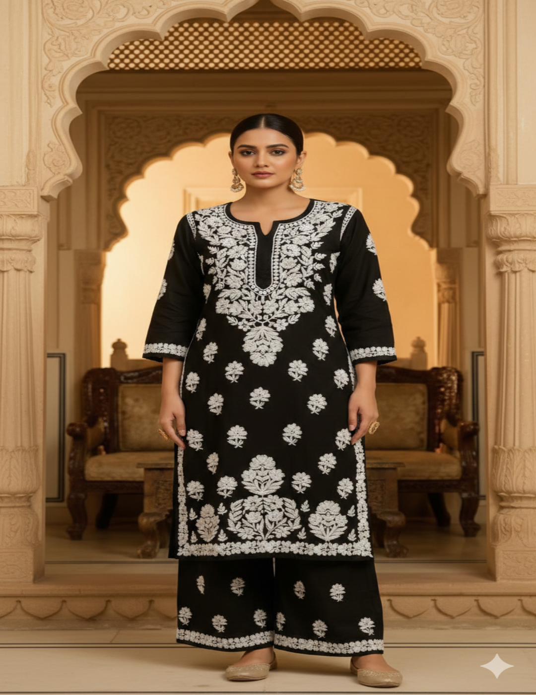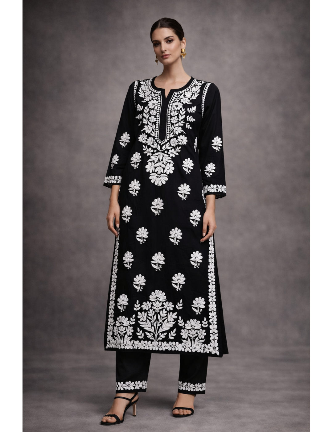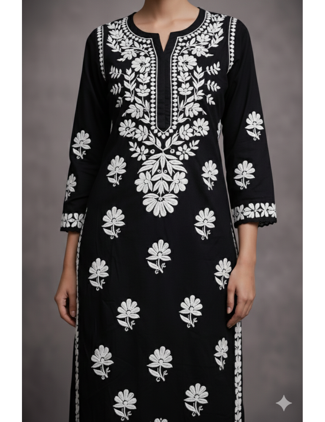 描述:迷人的粉红色花朵 Chikankari 长 kurti,展示精美的手工刺绣,打造优雅时尚的整体效果。