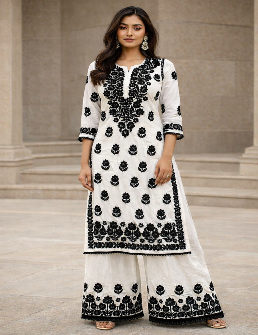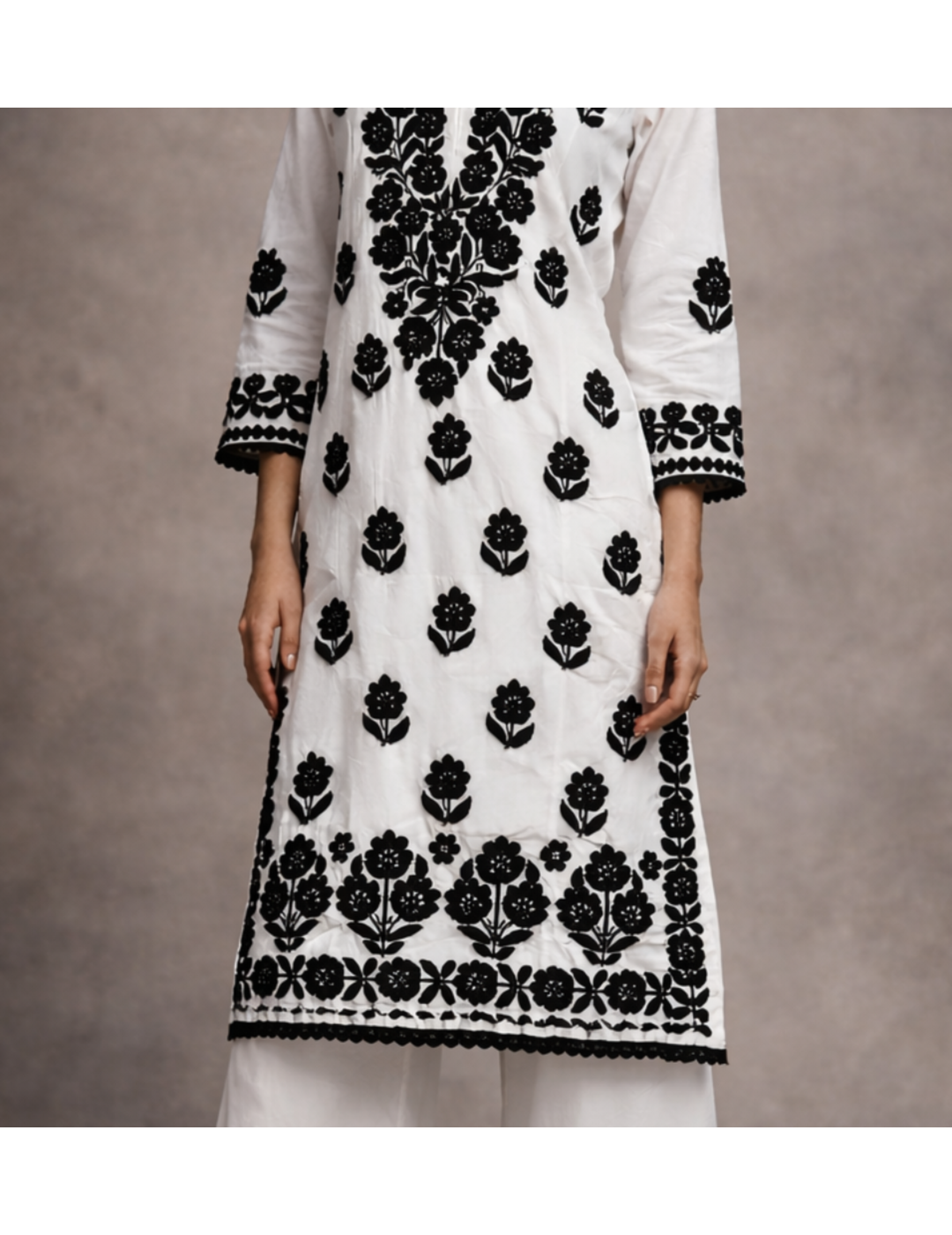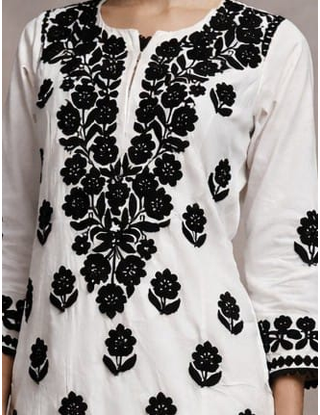 描述:迷人的粉红色花朵 Chikankari 长 kurti,展示精美的手工刺绣,打造优雅时尚的整体效果。