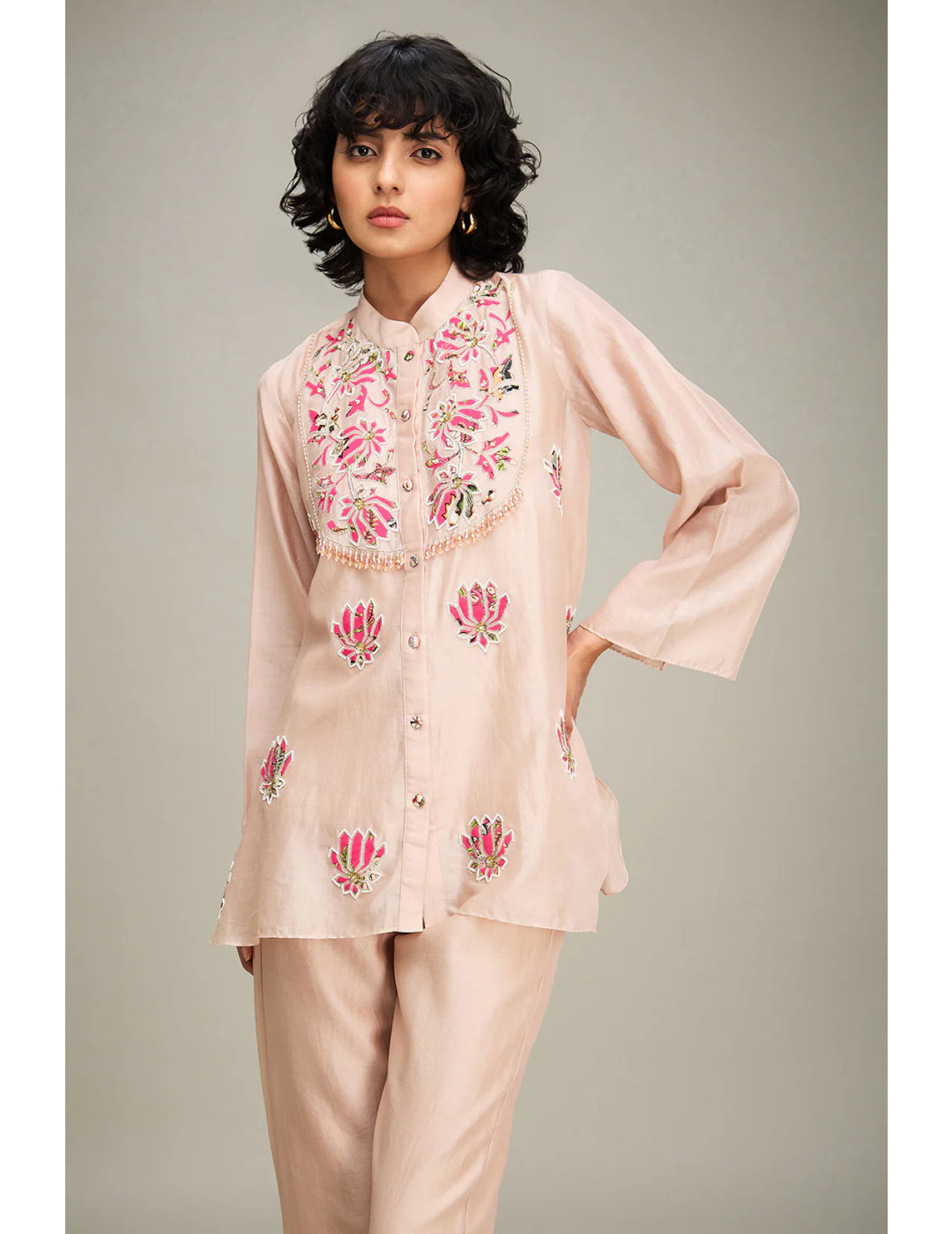 描述:采用精致的粉色角斗士剪裁夹克套装。它有亮片和精致的蕾丝装饰。