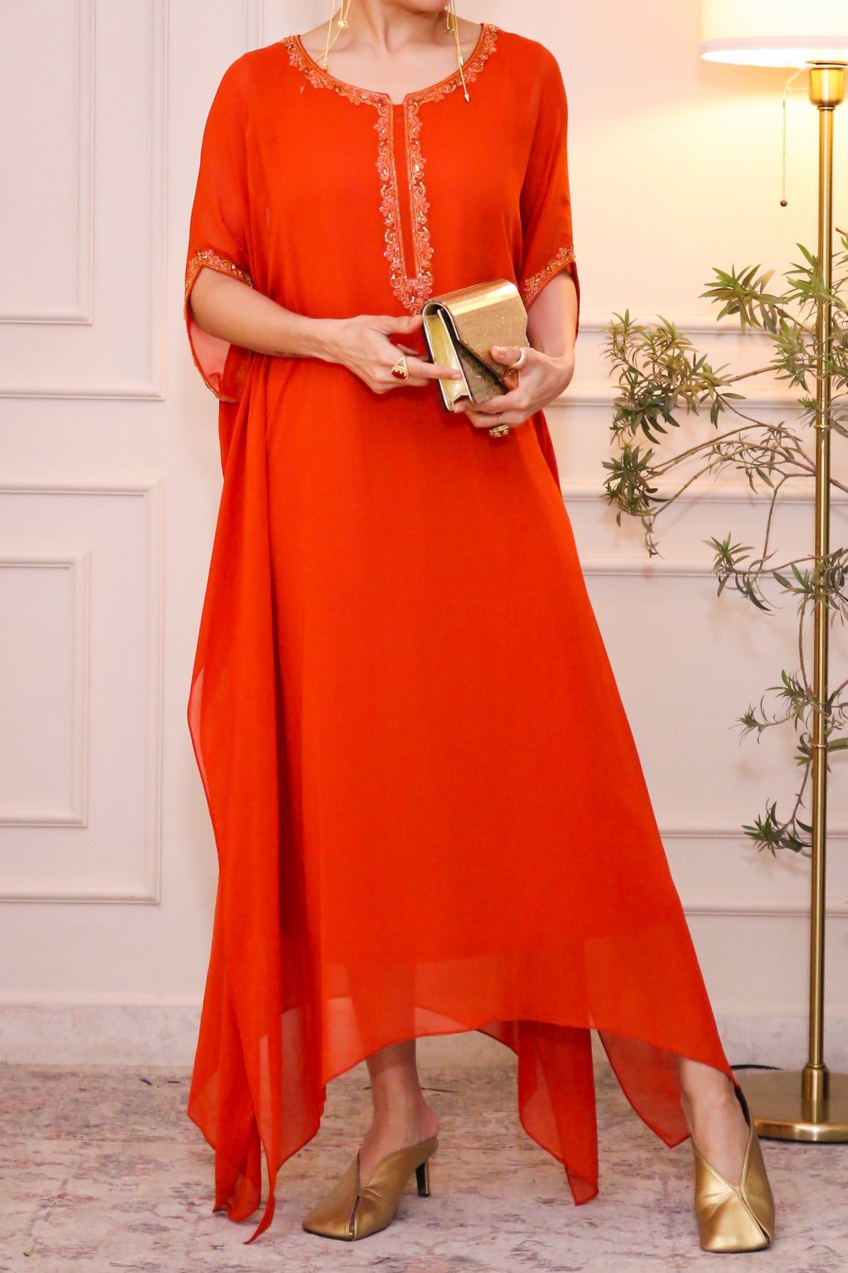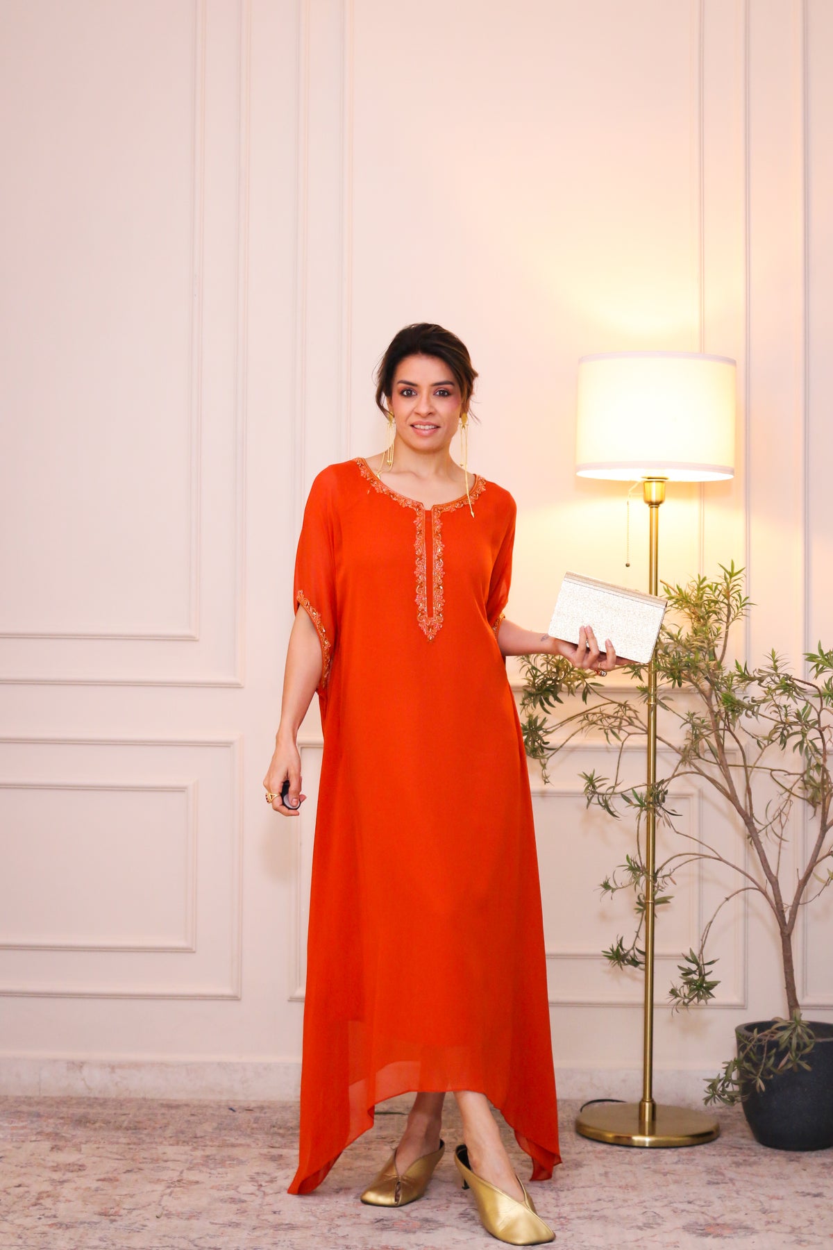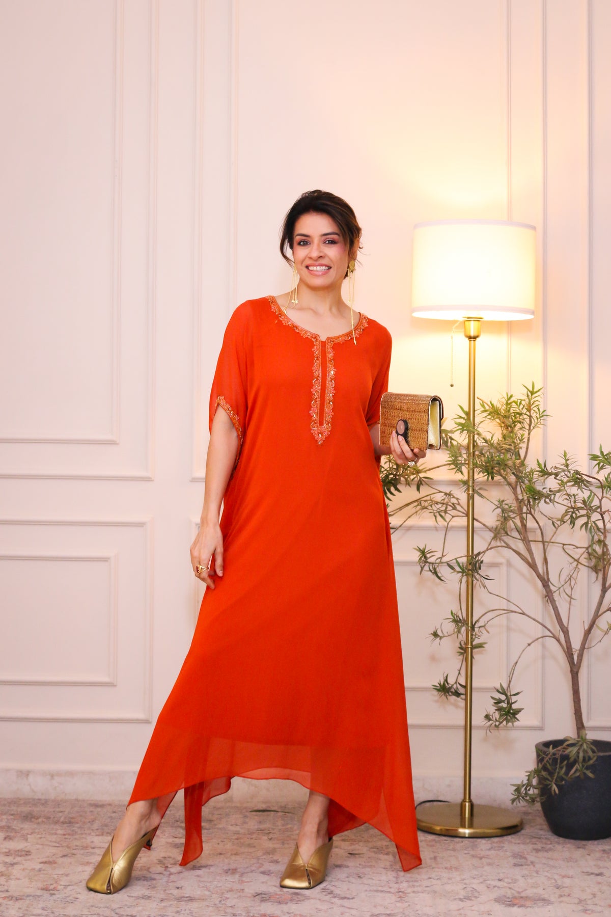 Description: Elegant tangerine kaftan crafted from viscose georgette fabric with hand embroidered neckline, featuring a flowy silhouette, breathable comfort, perfect for festive evenings and elegant occasions.