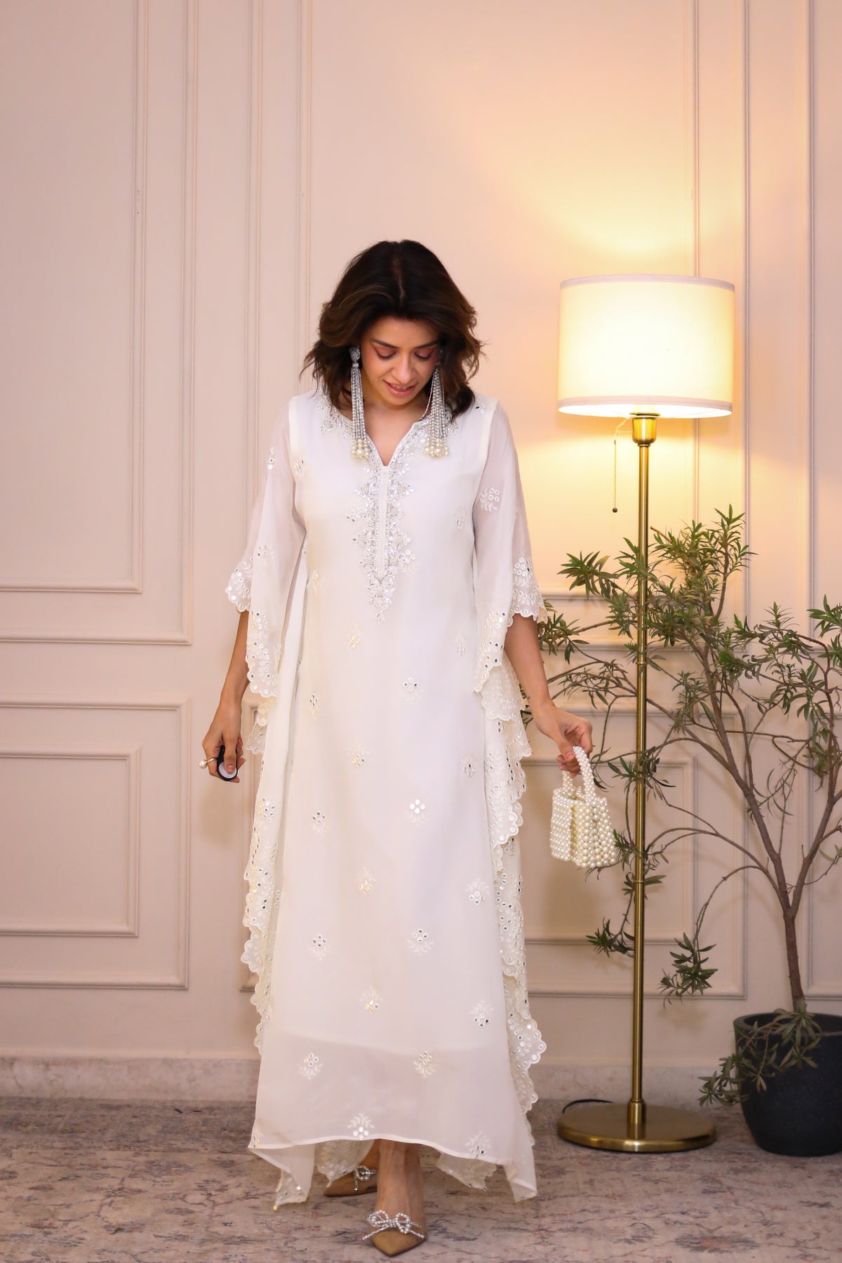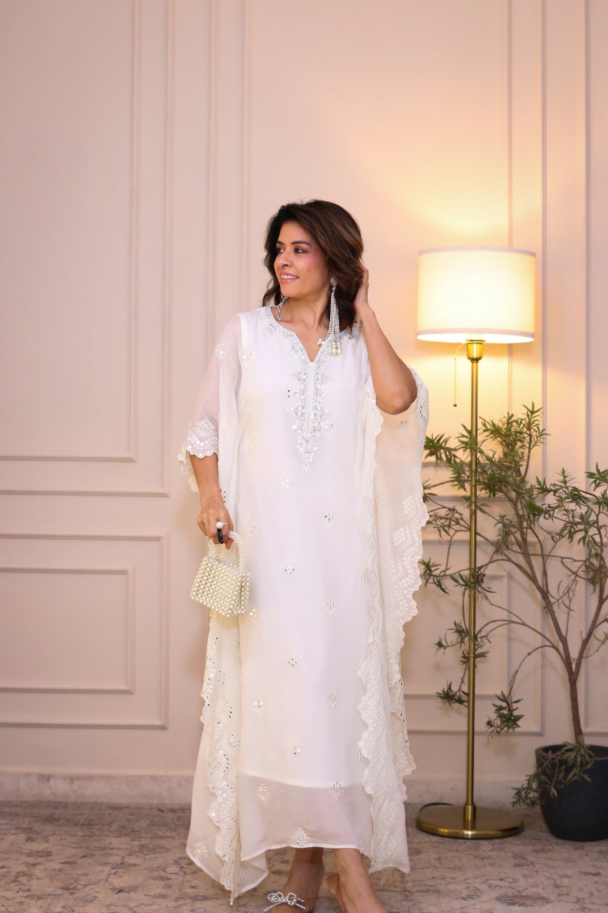Description: Elegant white kaftan crafted from viscose Chinnon fabric with hand embroidered neckline, featuring a flowy silhouette, breathable comfort, perfect for festive evenings and elegant occasions.