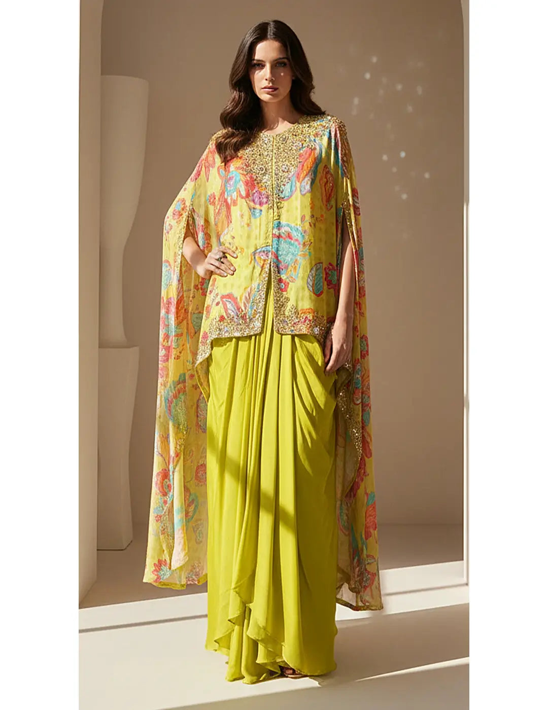 Description: A lime crepe floral cape set featuring elegant sequin and bead embroidery. Designed with a round neckline, jacket-style cape, and draped skirt for a refined festive silhouette.