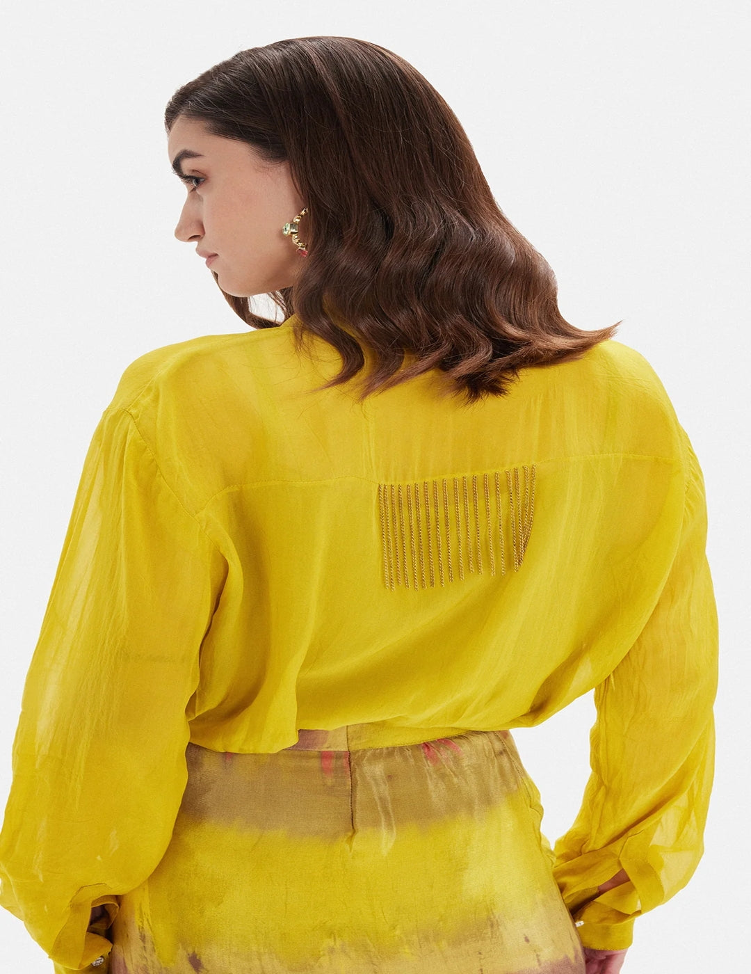 Description: A contemporary lime-toned set crafted in crepe, featuring delicate sequins, beads, and zari embroidery. Designed with a collared full-sleeve shirt paired with a fluid draped skirt, this set blends modern elegance with festive charm—ideal for evening events and celebrations.