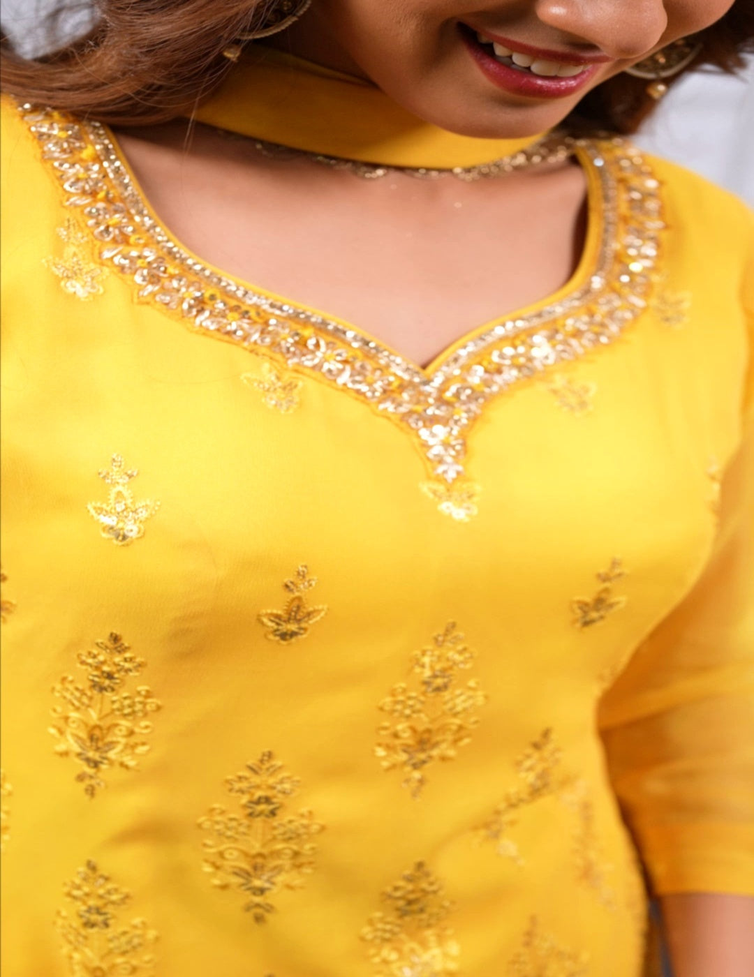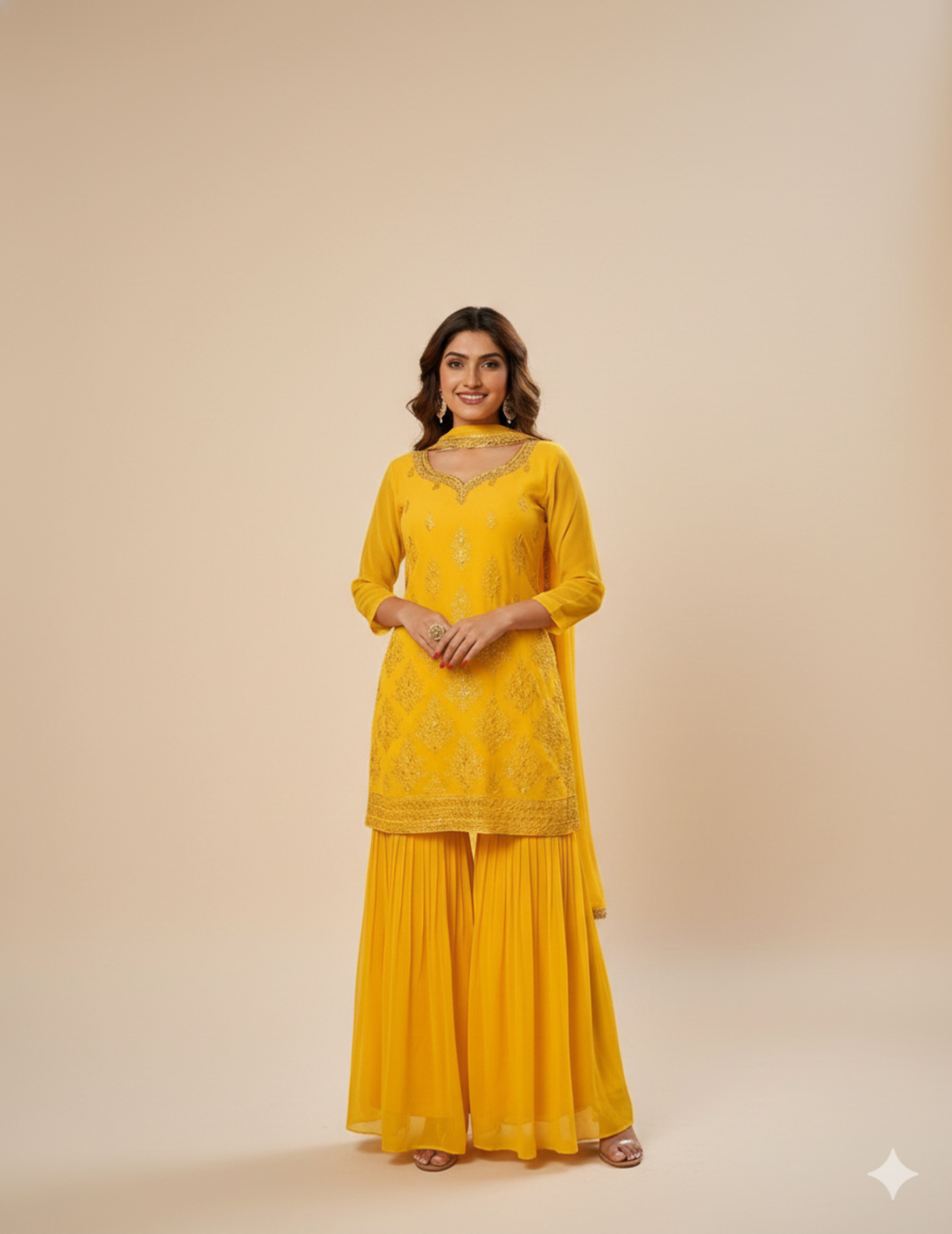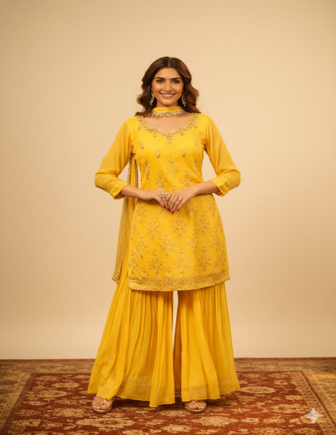 Radiate festive elegance in this stunning yellow sharara set, exquisitely detailed with fine threadwork embroidery and paired with a graceful embroidered dupatta finished with delicate lace accents. Crafted in a soft, flowy fabric that drapes beautifully, this ensemble is designed to flatter while making a refined statement. Perfect for festive celebrations, daytime soirées, and special gatherings where effortless luxury takes center stage.