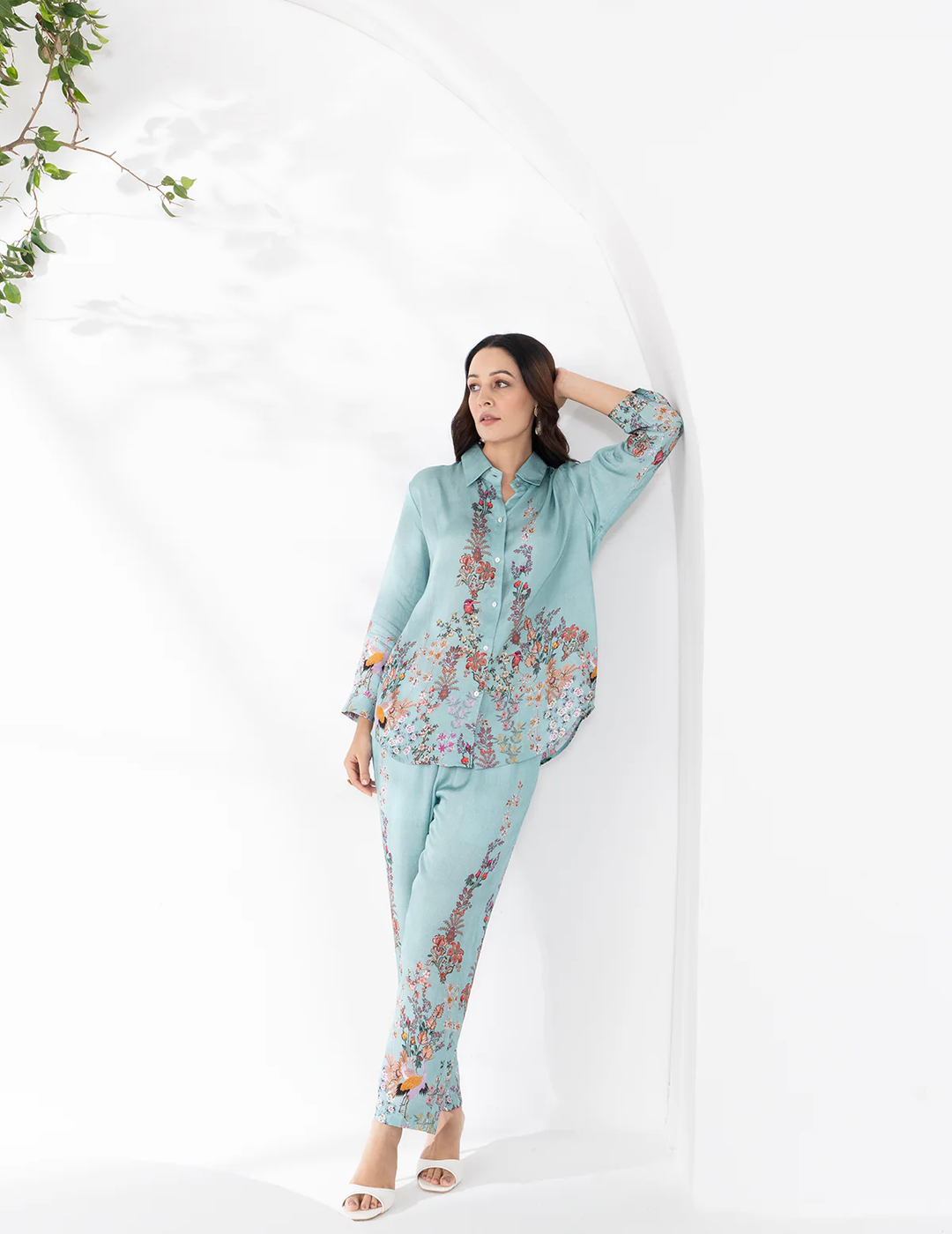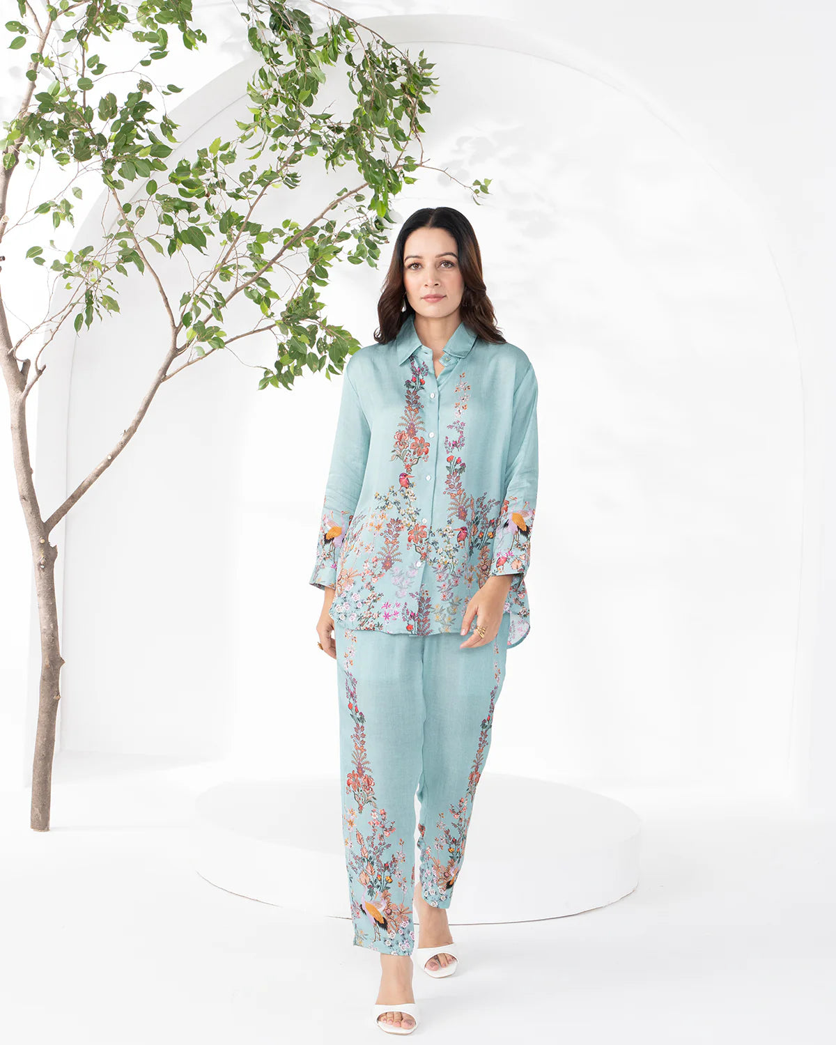 Description: Elegant satin linen trousers in a soothing aqua tone, adorned with delicate floral and bird-inspired prints. Designed with a relaxed silhouette and fluid drape, they offer effortless comfort with a refined, nature-inspired charm.
