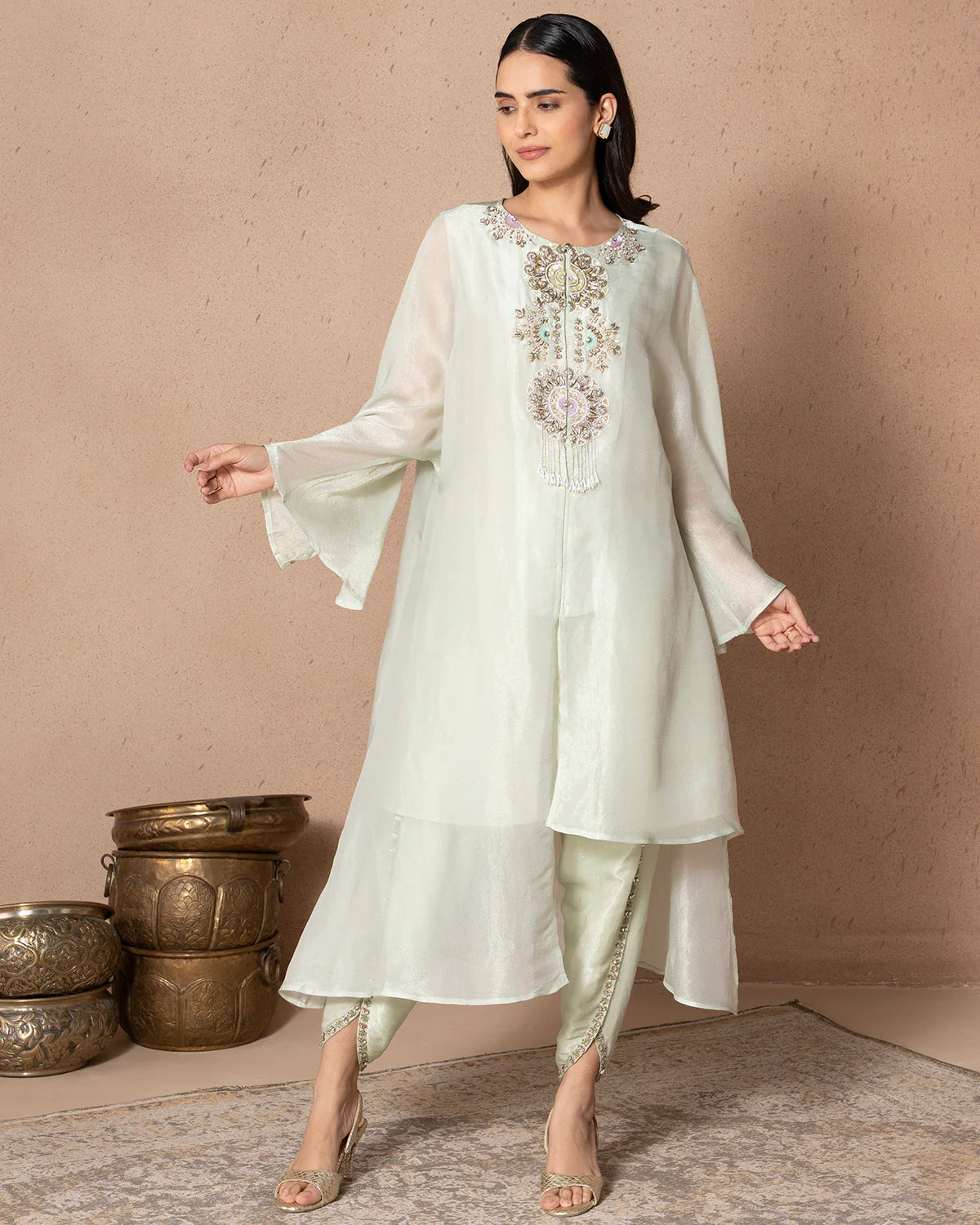Description : Elegant tissue tulip pants featuring soft lining and delicate hand embroidery on the edges — a perfect match for our heavily embroidered Pixie Indo-Western kurta.