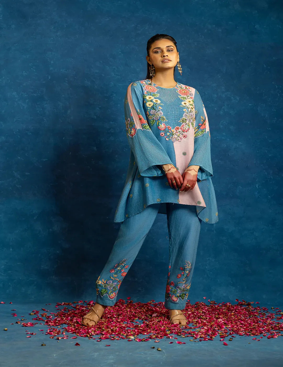 Description: A blue Rangtara colour-blocked kurta with elegant appliqué detailing, paired with printed linen pants. A relaxed, contemporary set for effortless daywear.