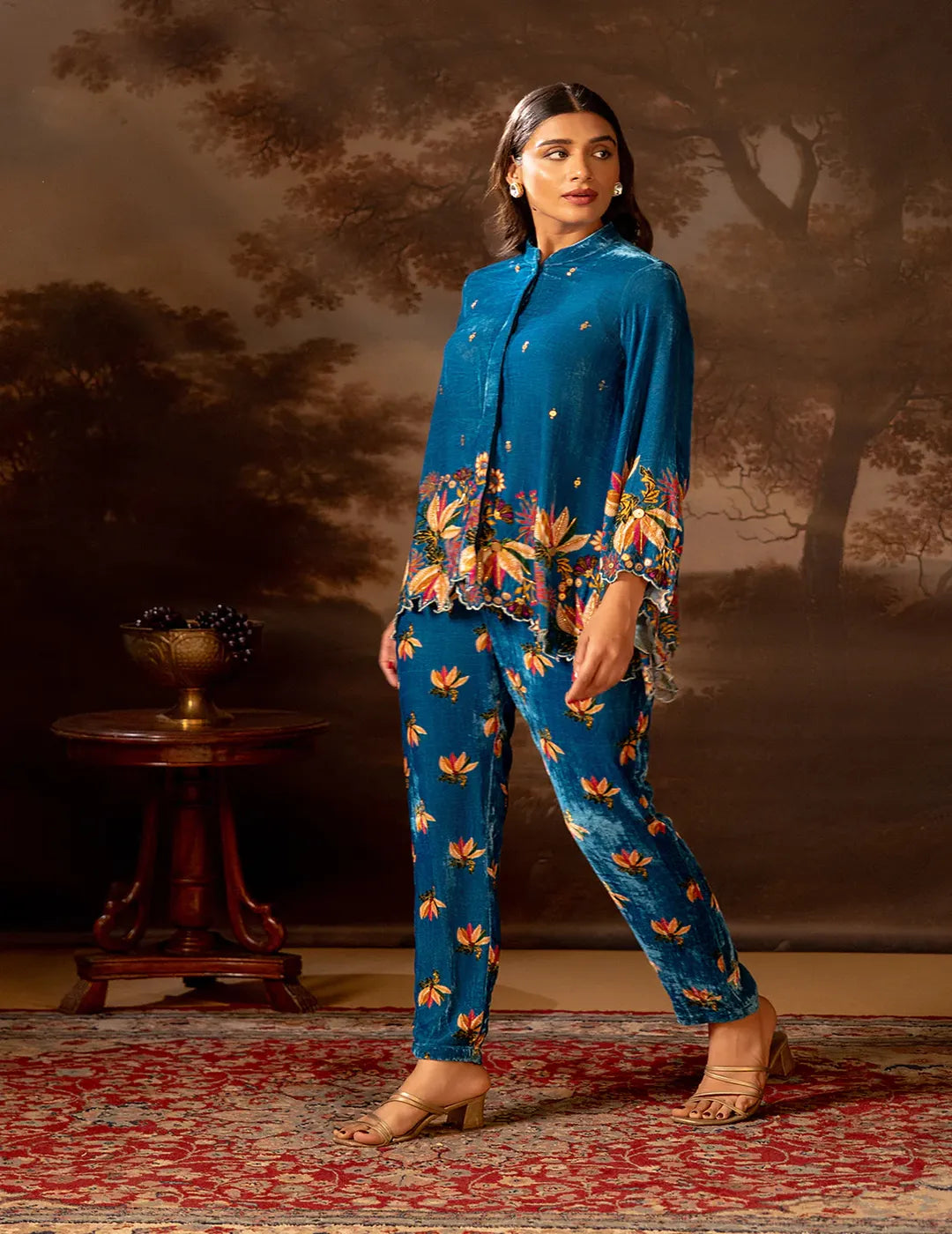 Description: Elegant Aarani embroidered co-ord set featuring a black embellished shirt with cutwork hem and matching velvet pants.