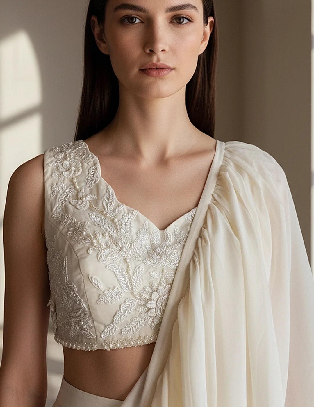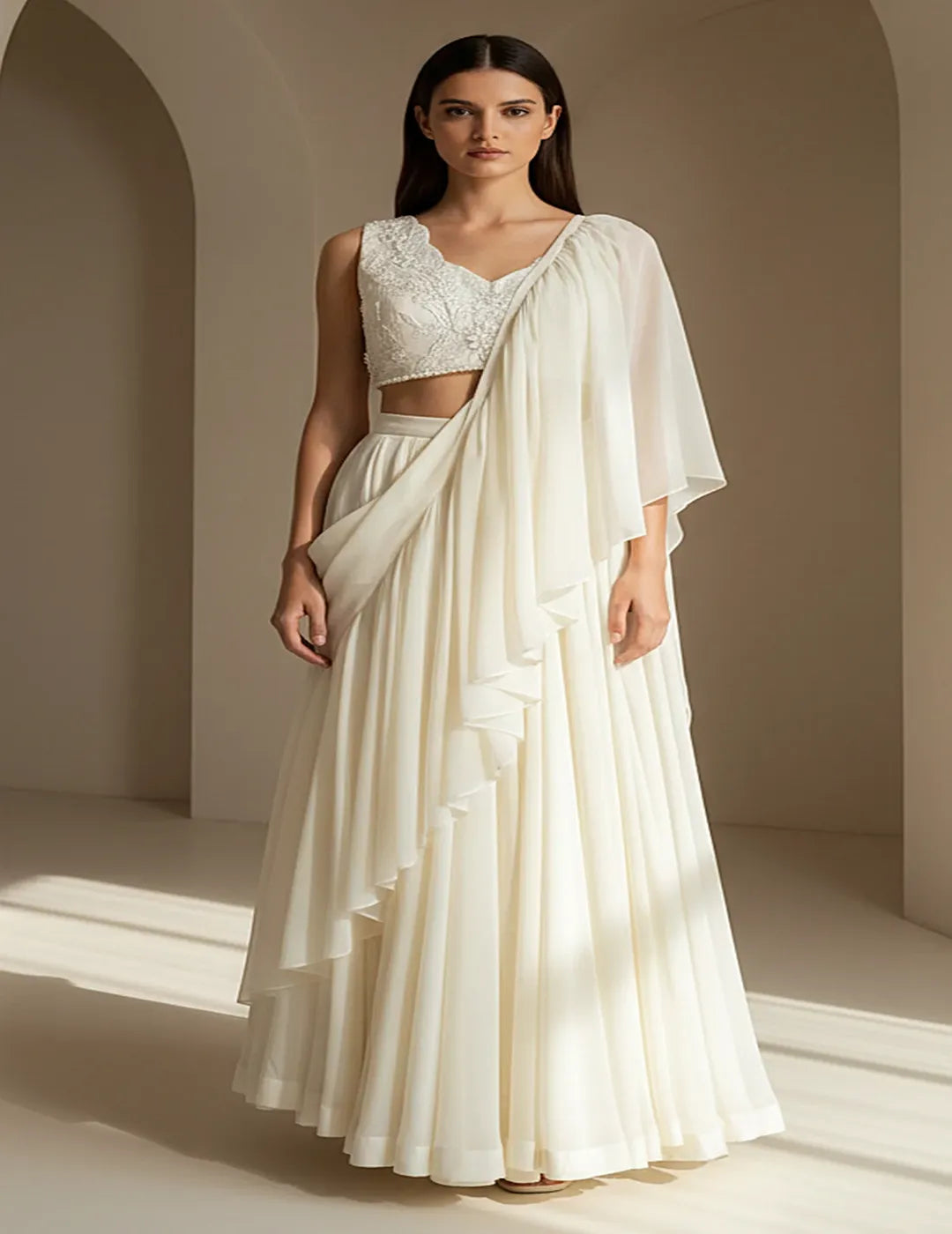 Description: An elegant ivory organza pleated saree adorned with delicate bead and pearl embroidery. Paired with a sleeveless V-neck blouse, this draped saree offers a refined blend of modern ease and timeless grace—ideal for festive and wedding occasions.