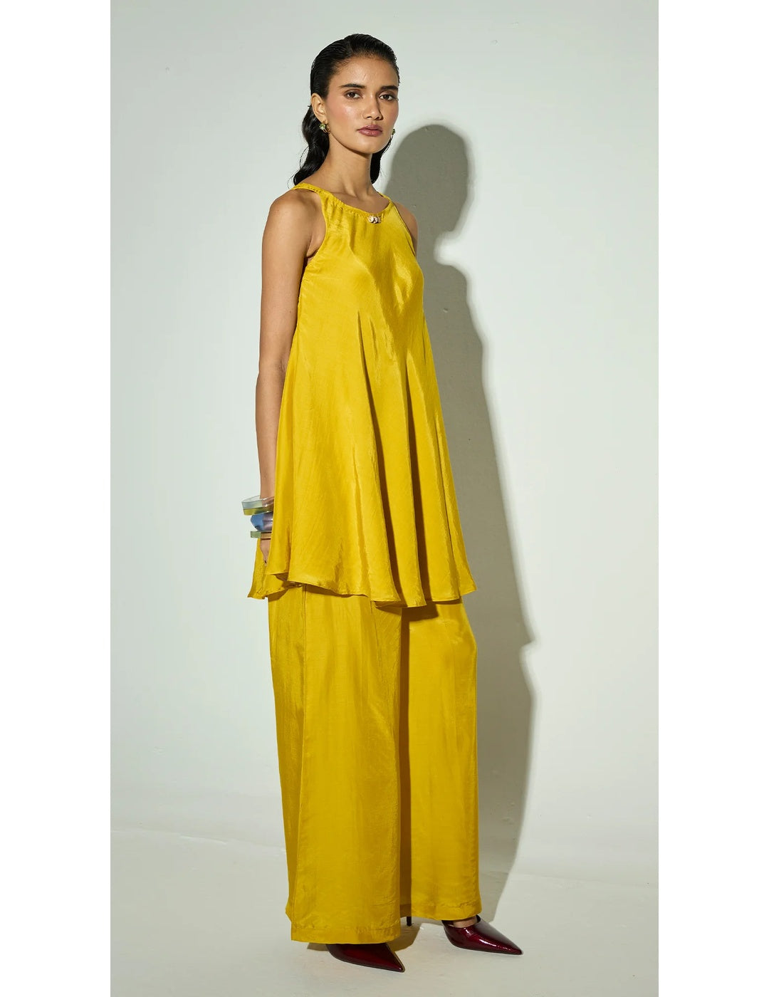 Description: A mustard Bamber silk set featuring a sleeveless flared tunic with round neckline, paired with wide palazzo pants for a graceful, contemporary ethnic look.