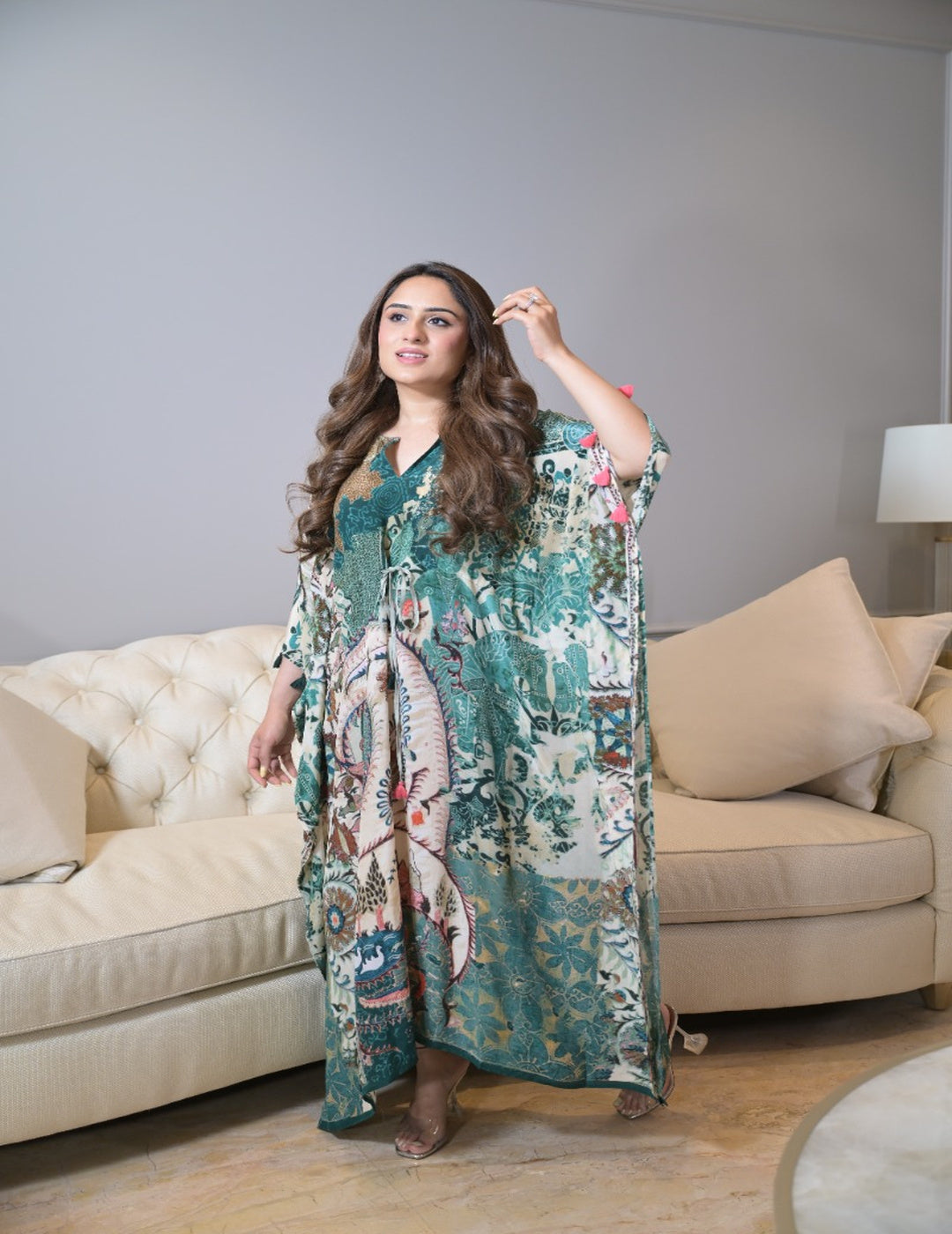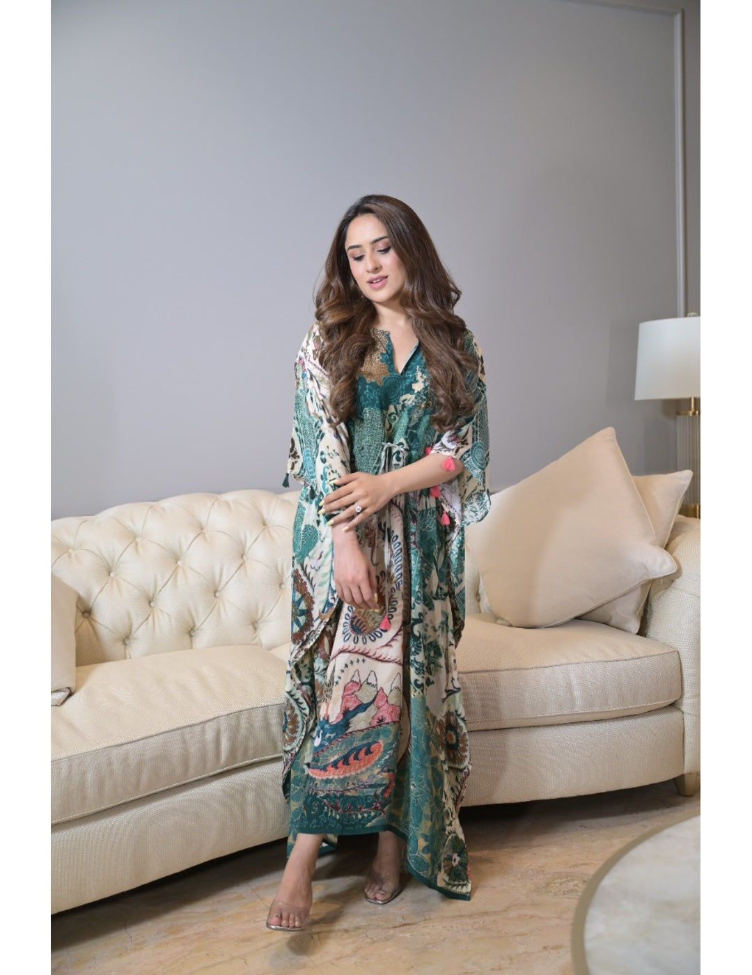 The Boozy Button Bahar Green Satin Silk Long Kaftan