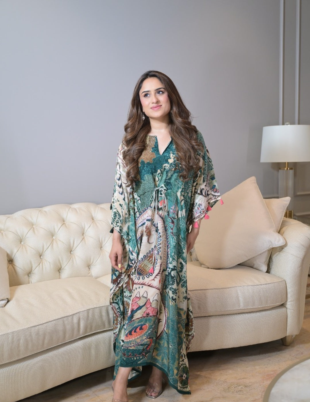 Description: A stylish green long kaftan crafted in luxurious Moroccan silk with timeless fusion prints and a relaxed silhouette. Soft on the skin and perfect for both casual and formal wear from AM to PM.