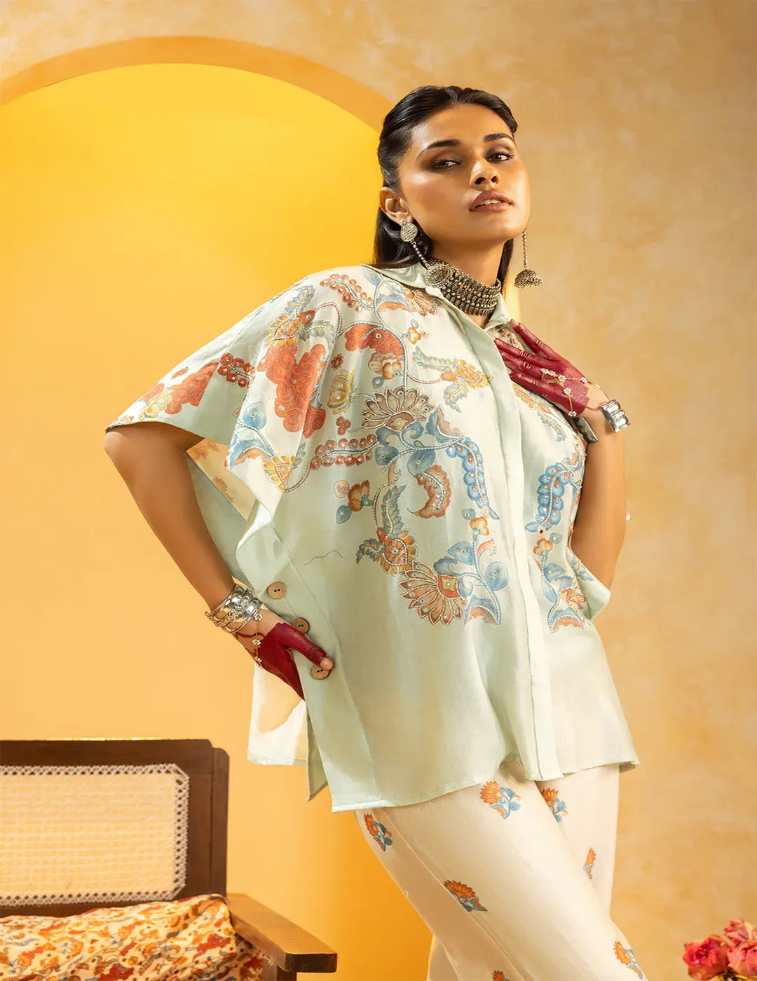 Description: A blue Rangtara embellished shirt paired with printed straight chanderi pants, creating a relaxed and elegant co-ord set for festive or day occasions.