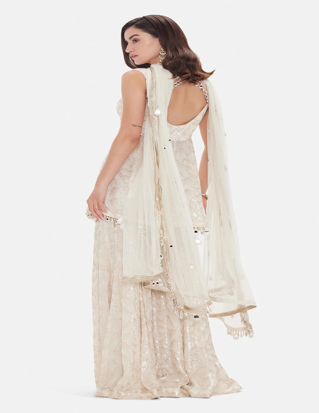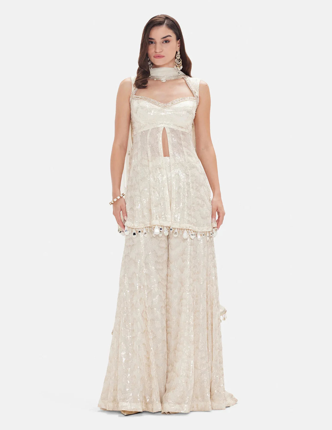 A regal sharara set crafted in luxurious ivory georgette, adorned with intricate beadwork, sequins and Swarovski embellishments. The structured bustier with a flattering Queen Anne neckline paired with a flowing sharara and dupatta creates a look that is both elegant and statement-making — perfect for grand celebrations.