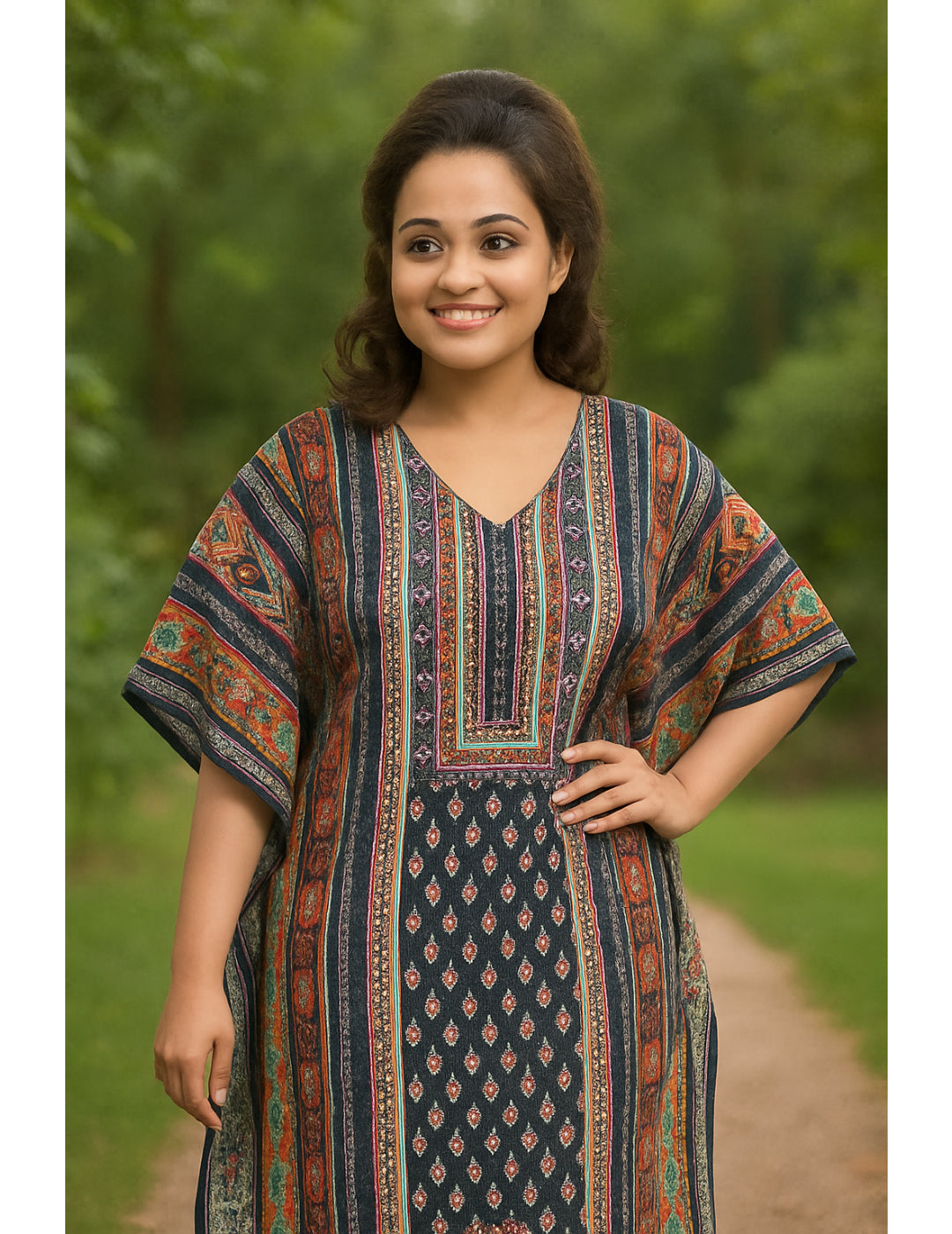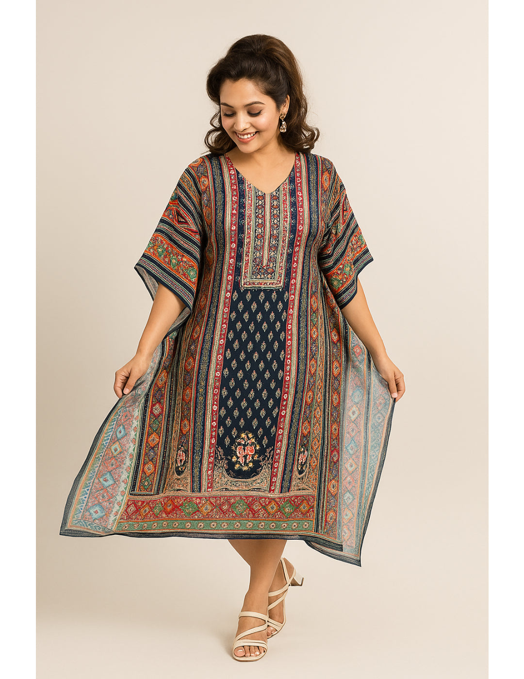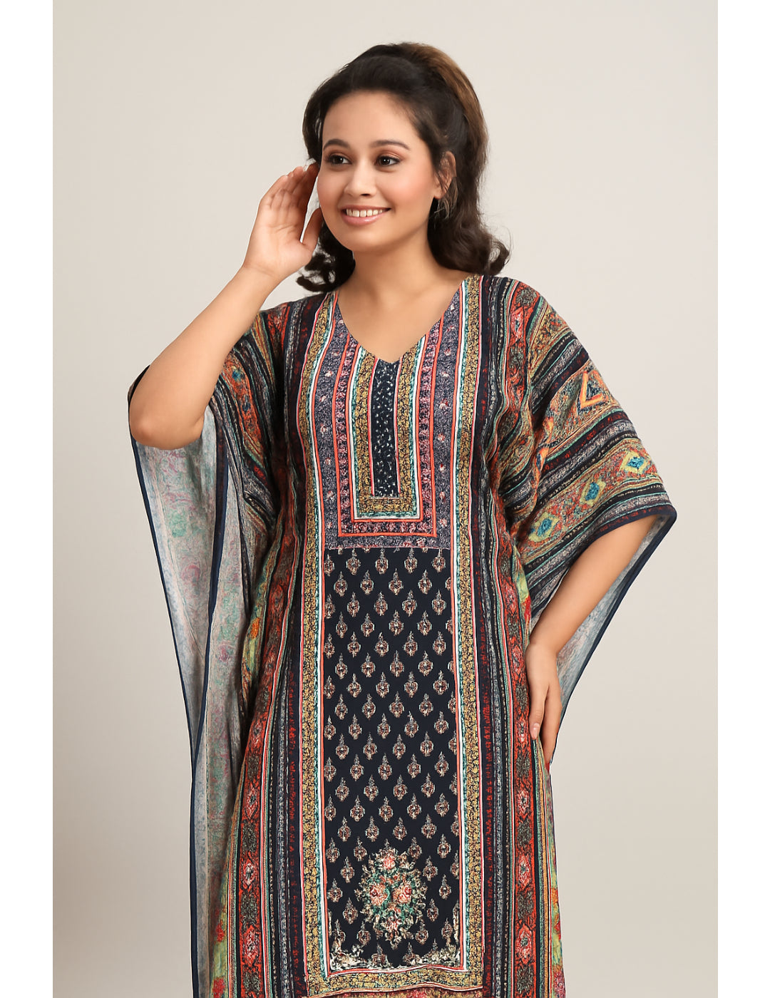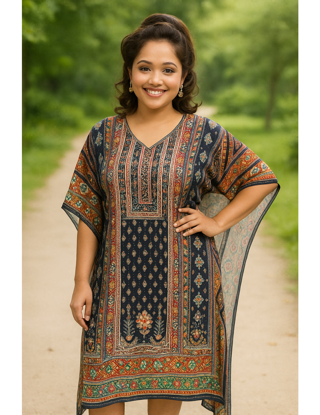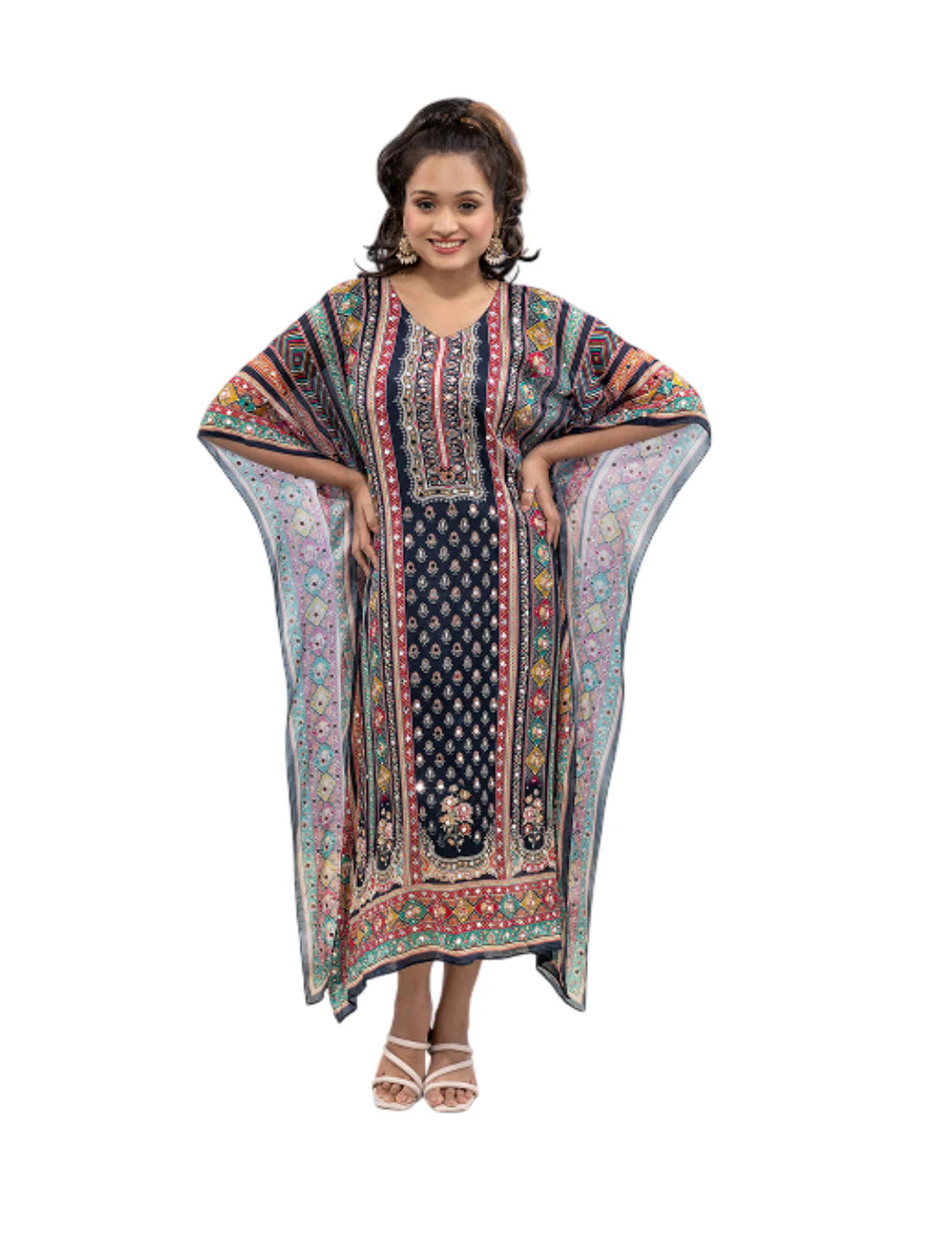 描述: 一件饰有美丽金色装饰的黑色长袍,由粘胶乔其纱制成。非常适合休闲、特殊场合或节日穿着