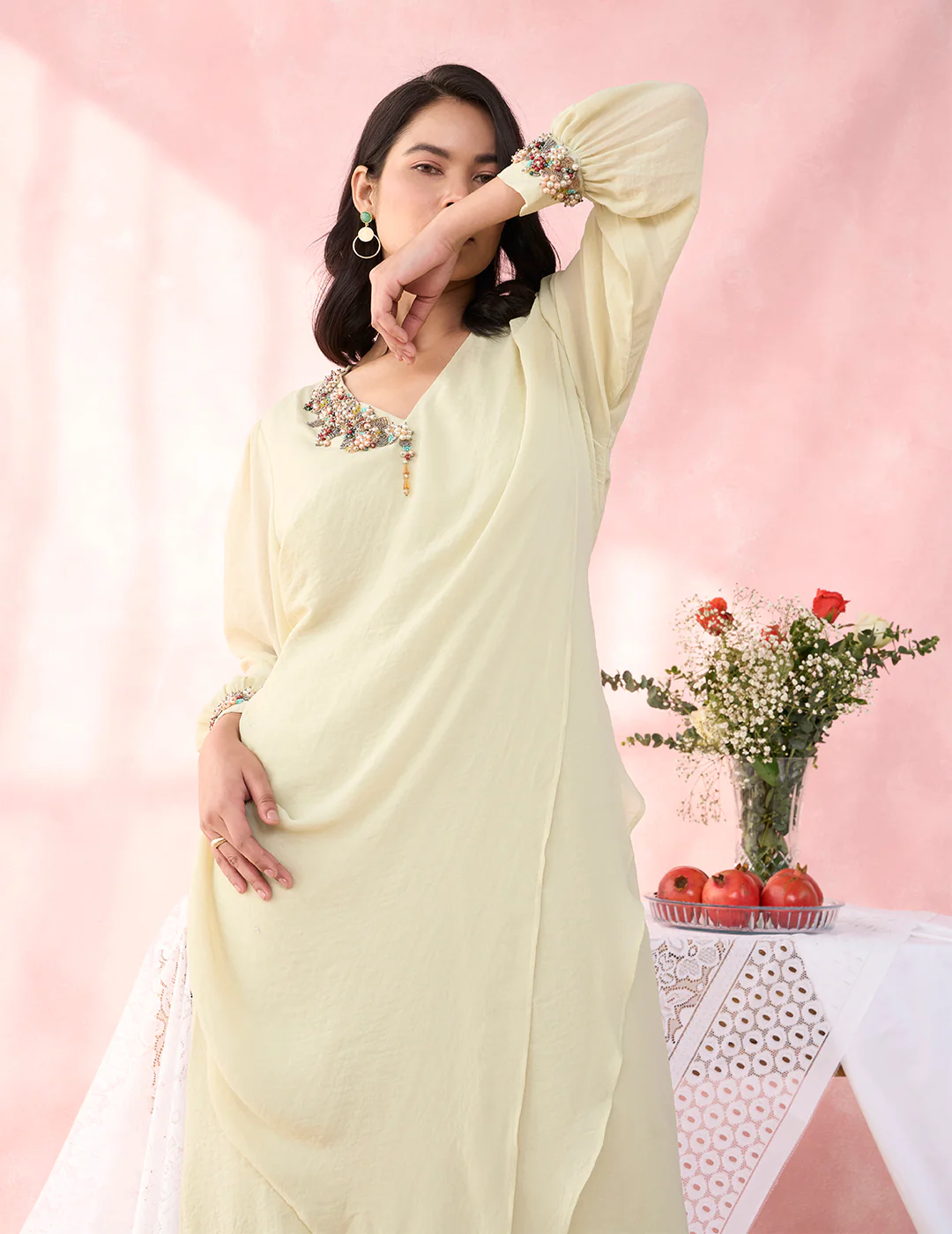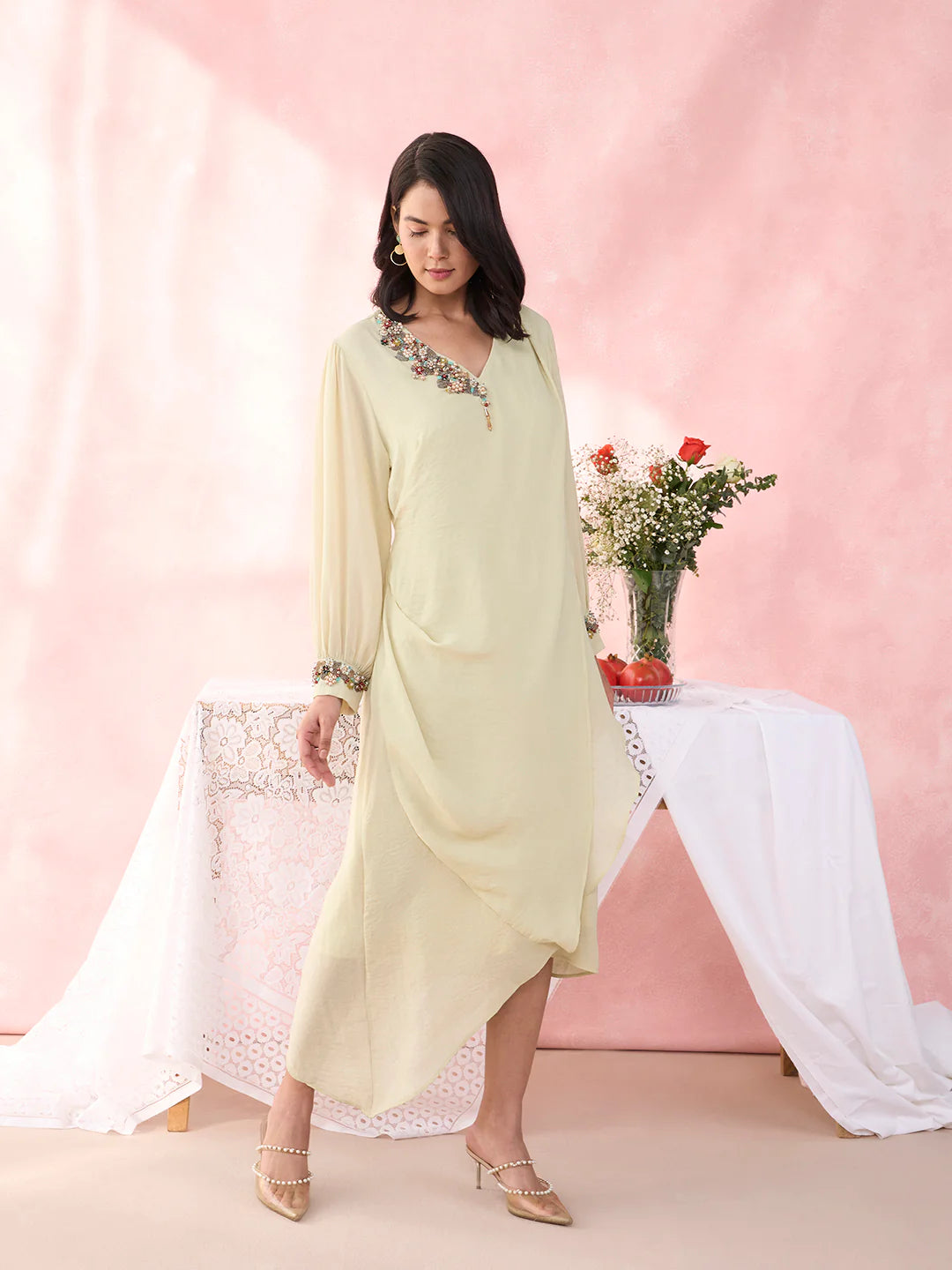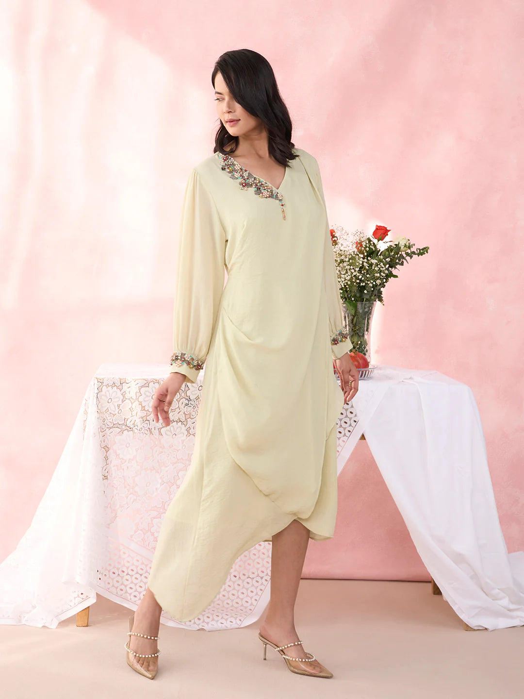 Description: A fresh, fluid silhouette crafted in sheer hammered georgette, designed to glide effortlessly with every movement. The clean, minimal form is beautifully elevated with a richly embellished neckline, adding depth and elegance. Vibrant yet refined, it transitions seamlessly from festive brunches to sunset soirées.